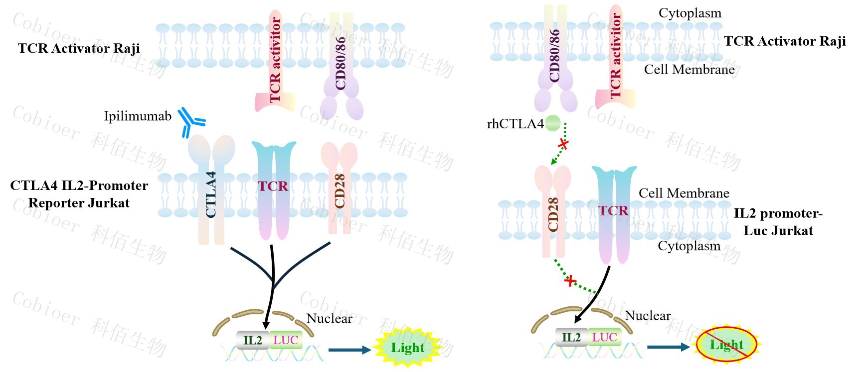 TCR Activator Raji 报告基因药靶模型很好的模拟了体内 CD28&CD80/CD86 或者CTLA4 的信号转导过程,原理见下图所示。![]() Figure 1. TCR Activator Raji 细胞模型原理图  |