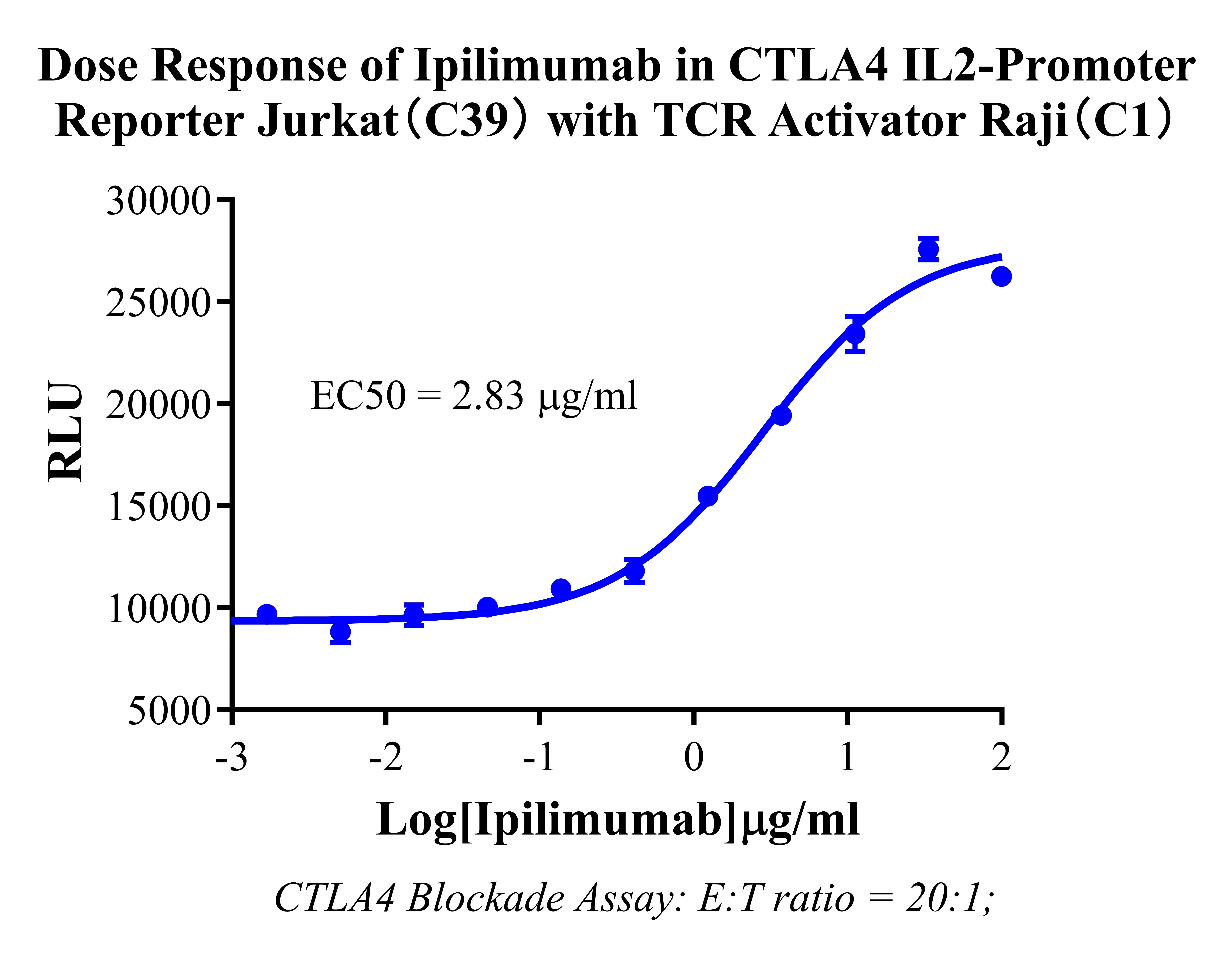 Figure 5. Dose Response of lpilimumab in CTLA4 IL-2 Promoter Reporter-Jurkat (C39)with TCR Activitor Raji (C1).