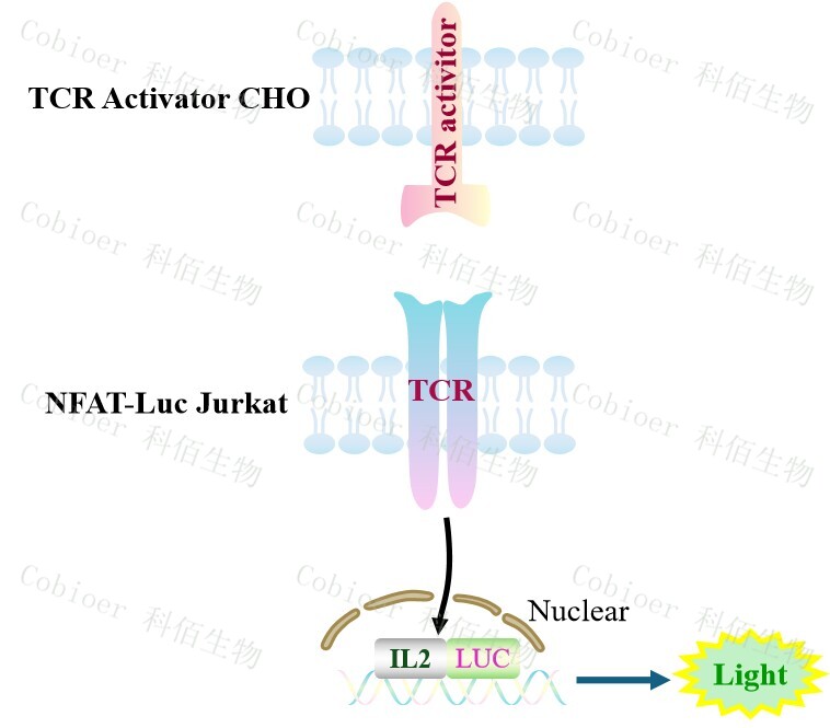 TCR Activator CHO 报告基因药靶模型很好的模拟了体内 TCR 的信号转导过程,原理见下图所示。![]() Figure 1. TCR Activator CHO 细胞模型原理图  |