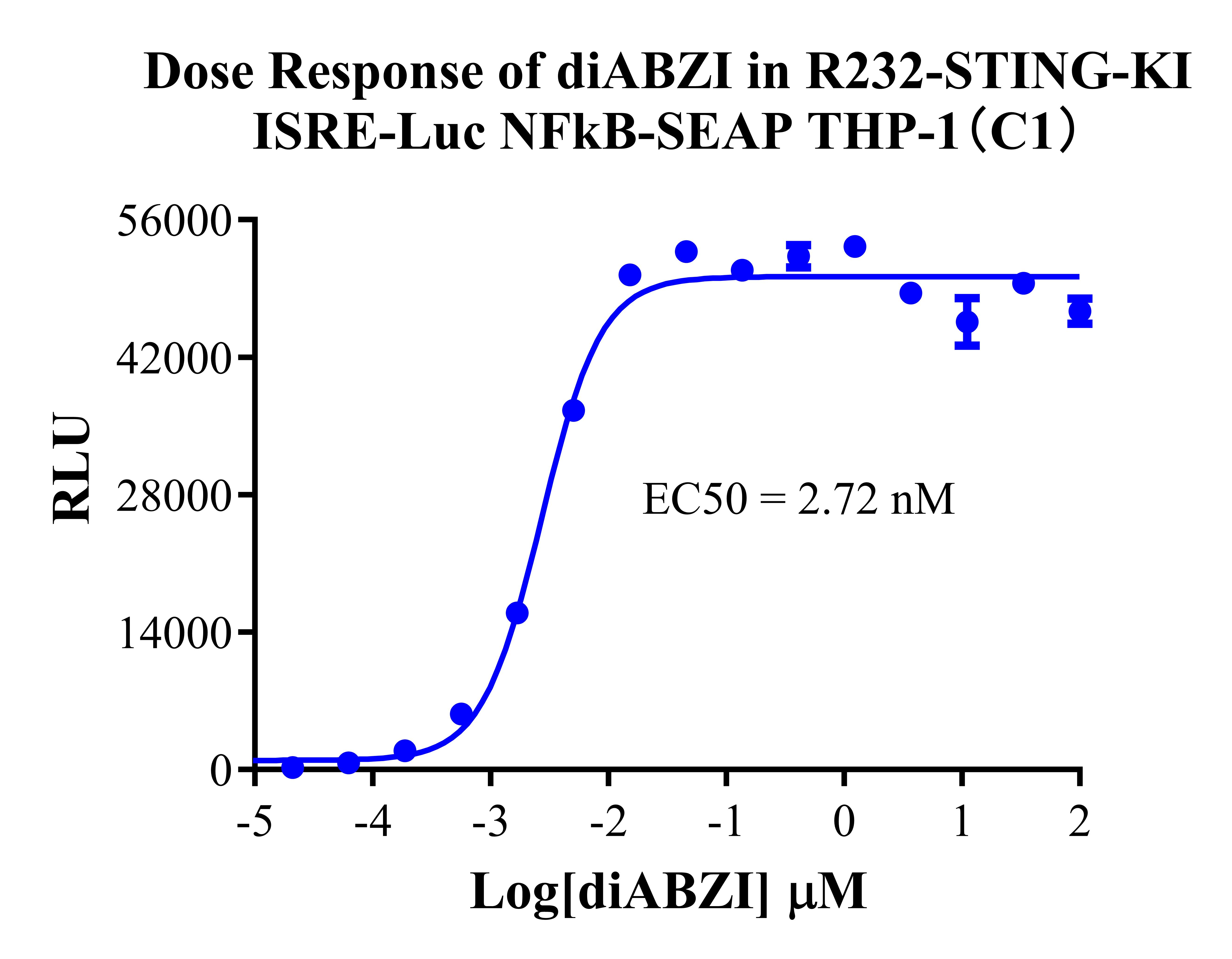 R232-STING-KI ISRE-Luc NFκB-SEAP THP-1 报告基因细胞,针对 STING 激动剂和拮抗剂的药物发现,利用 STING 蛋白调控干扰素(IFN)及其下游基因表达的原理,在 THP-1 细胞上构建了 2 个诱导型的报告基因系统:一个是 IFN 刺激反应元件 (ISRE),下游接入 Luc 的分泌型荧光素酶,可以在底物的刺激下,催下产生化学发光信 号,该报告基因可以评估 IRF 通路,比如 type I IFNs and RLR(RIG-I-like receptor),CDS (cytosolic dsDNA sensor)或 STING agonists;另外一个是 NFκB 通路,下游接入分泌型胚 胎碱性磷酸酶(SEAP)报告基因,可以响应与 NFκB 通路相关的一些刺激。R232-STING- KI ISRE-Luc NFκB-SEAP THP-1 报告基因药靶模型很好地模拟信号转导过程,原理见下图所示。![]() Figure 1. R232-STING-KI ISRE-Luc NFκB-SEAP THP-1 细胞模型原理图