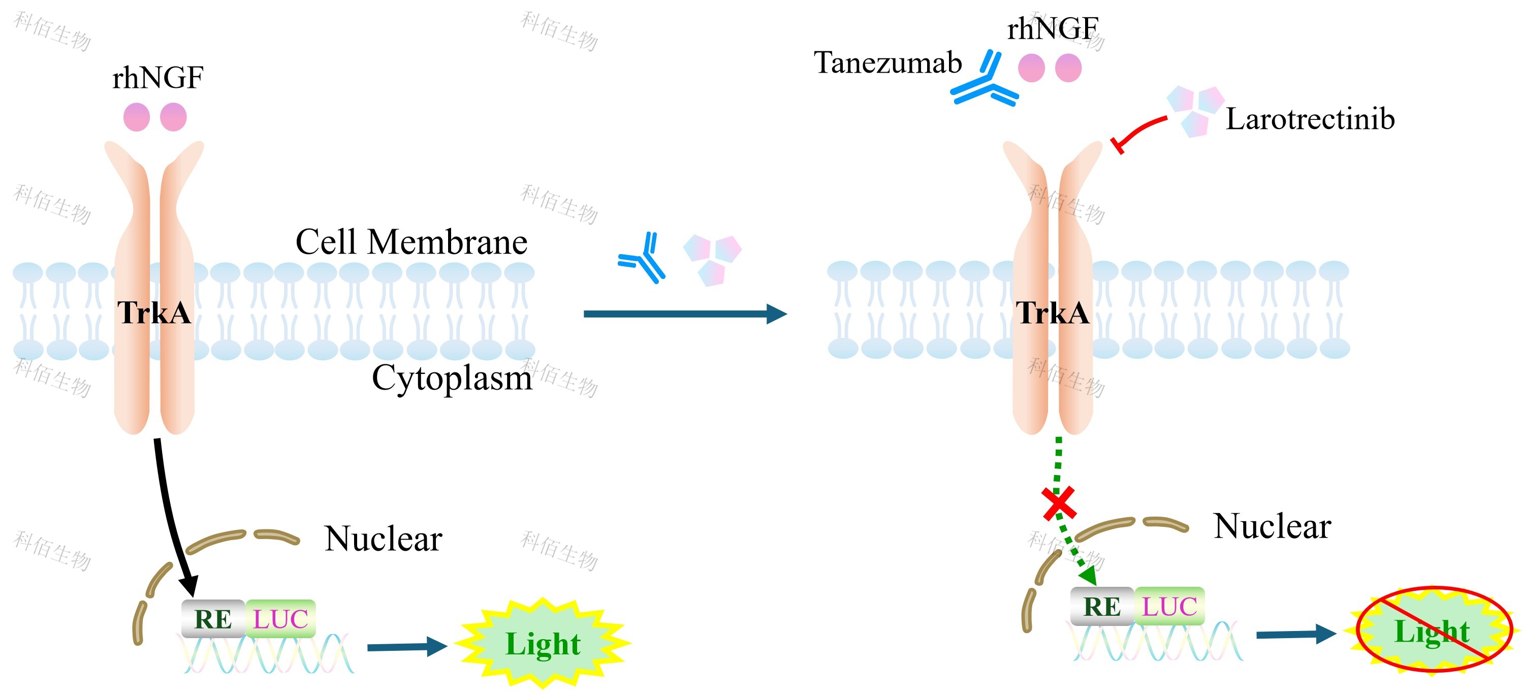NGF/TRKA Effector Reporter Cell 报告基因药靶模型很好的模拟了体内 NGF/TRKA 的 信号转导过程,原理见下图所示。