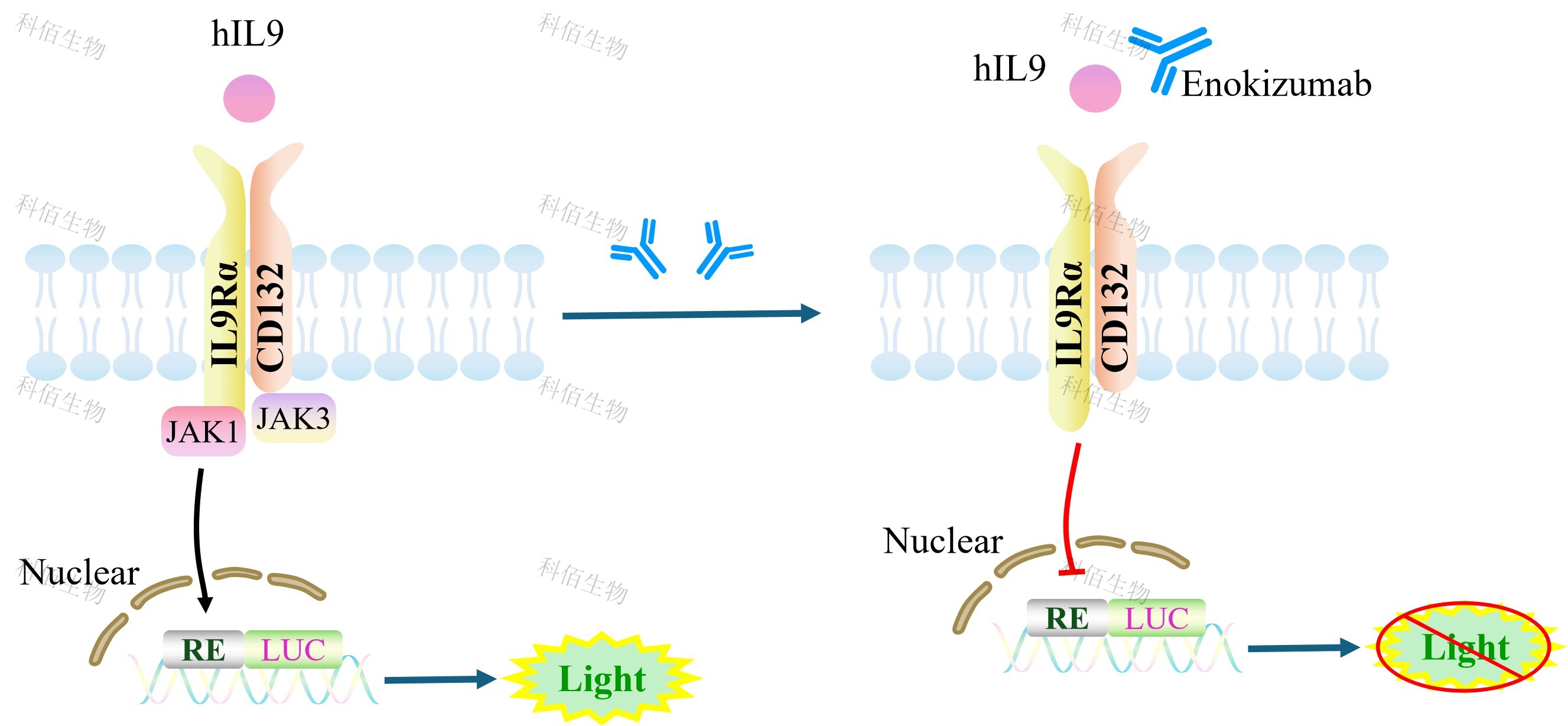 IL9 Effector Reporter Cell 报告基因药靶模型很好的模拟了体内 IL9 的信号转导过程, 原理见下图所示。 ![]() Figure 1. IL9 Effector Reporter Cell 模型原理图 |