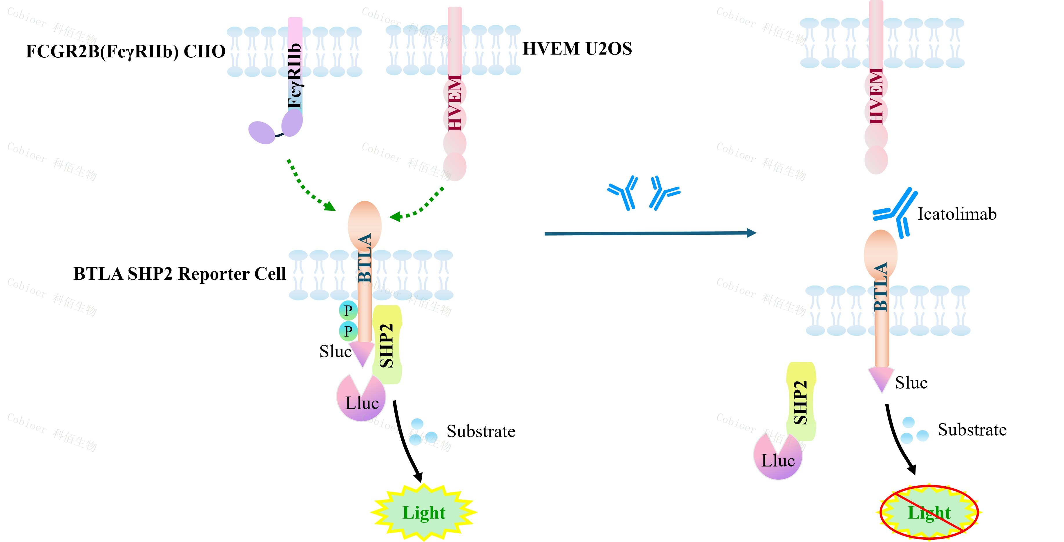 BTLA SHP2 Reporter Cell 报告基因药靶模型很好的模拟了体内 BTLA/SHP2 的信号转导过程,原理见下图所示。![]() Figure 1. BTLA SHP2 Reporter Cell 细胞模型原理图 |