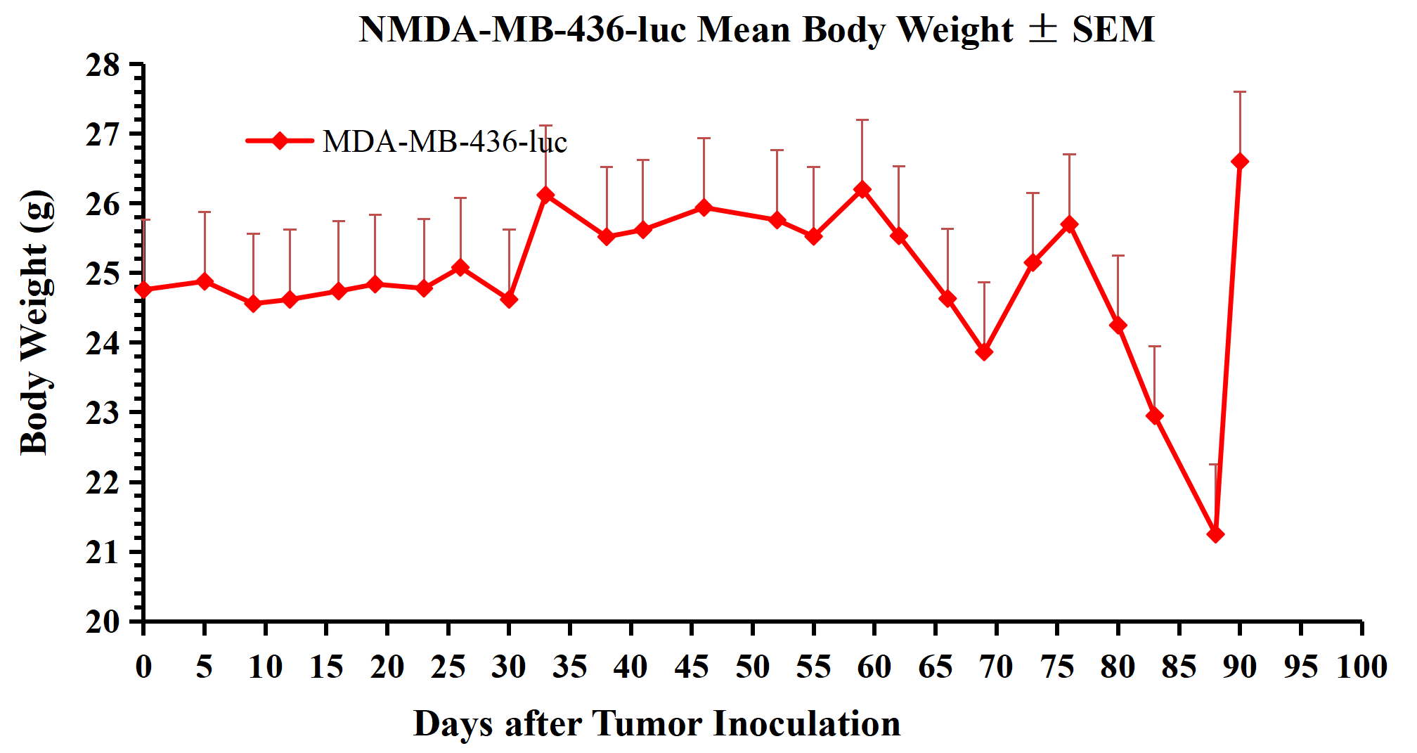 Figure 3.NMDA-MB-436-luc Mean Body Weight ± SEM.