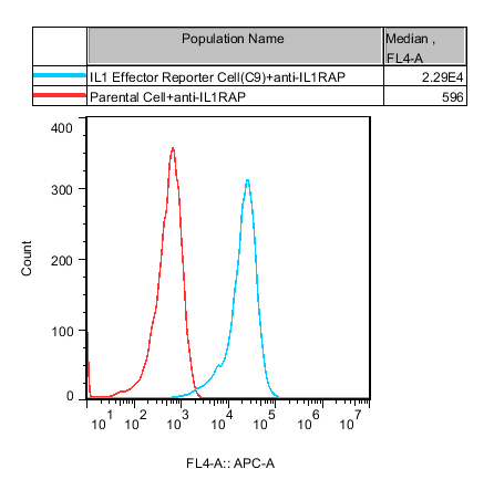 IV. Representative Data![]() Figure 2. Recombinant IL1 Effector Reporter Cell constitutively expressing IL1RAcP. ![]() Figure 3. Dose Response of Recombinant Human IL1β in IL1 Effector Reporter Cell (C9). ![]() Figure 4. Inhibition of rhIL1β-Induced Reporter Activity by IL1β Neutralization or ILlR Blocking Abs in IL1 Effector Reporter Cell(C9). |