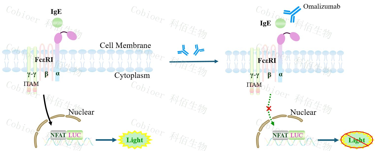 FcεRI Effector Reporter Cell 药靶模型很好的模拟了 FcεRI的信号转导过程,原理见下图所示。 Figure 1. FcεRI Effector Reporter Cell细胞模型原理图 |