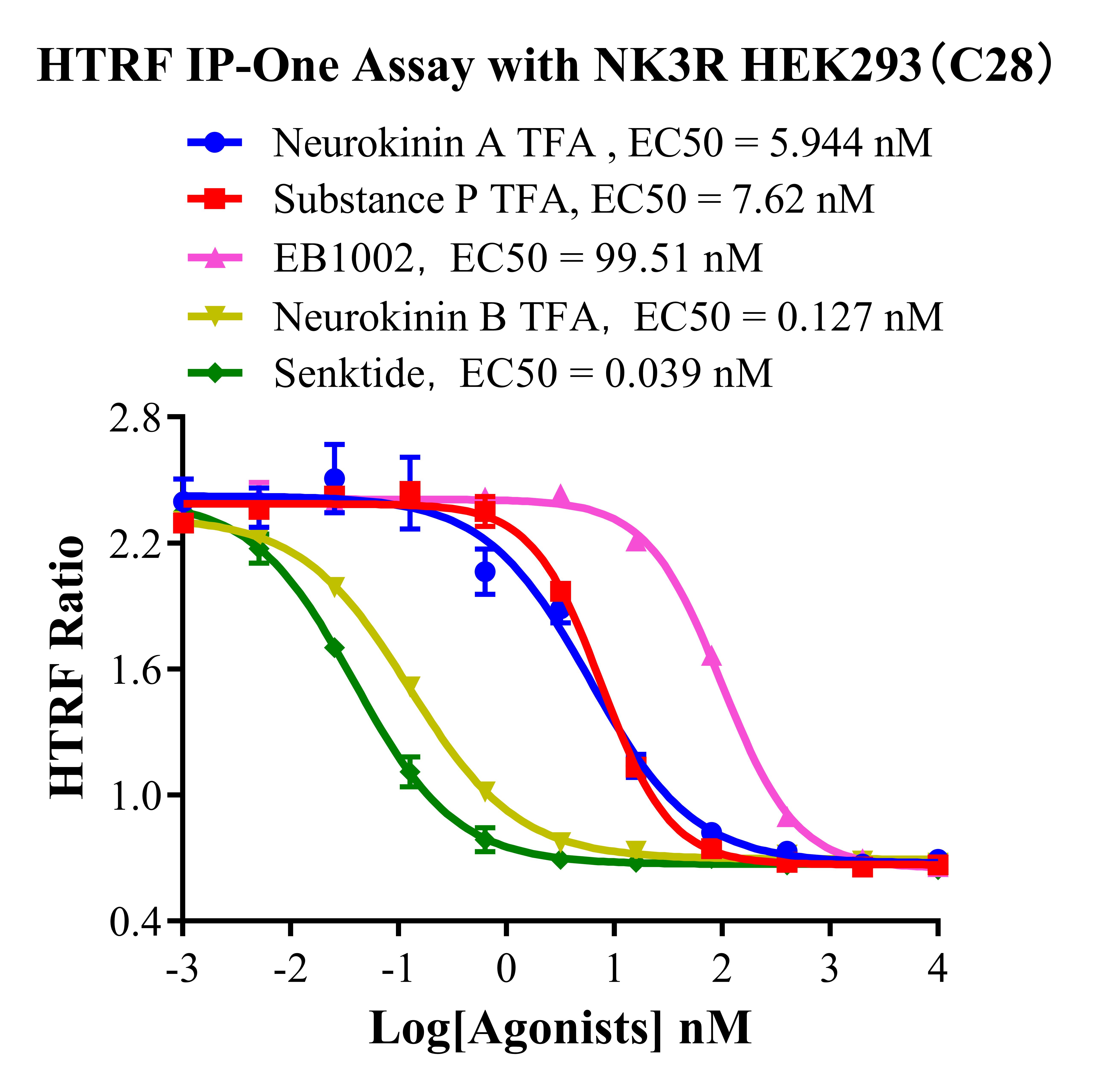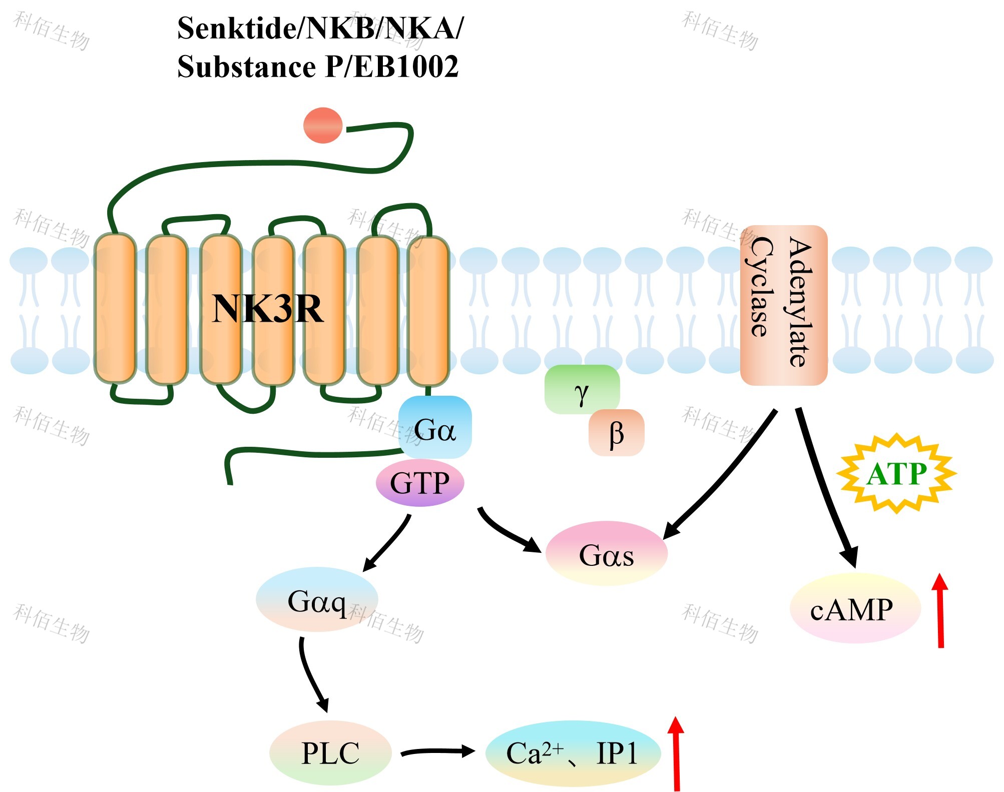 速激肽(Tachykinin)是在整个神经和免疫系统中表达的神经肽,作为兴奋性神经递质, 它们在调节各种生理功能中发挥重要的作用。在不同的速激肽中,P 物质(SP)、神经激 肽 A(NKA) 和 NKB 已得到充分研究。这些肽可以通过三种不同的 GPCR、神经激肽 1 受体(NK1R)、神经激肽 2 受体(NK2R) 和 NK3R 发挥作用。作为具有不同亲和力的 完全激动剂。 NK3R(Neurokinin 3 Receptor),又称 TACR3,是速激肽受体家族的重要成员,属于 GPCR 超家族。其内源性配体为神经激肽 B(Neurokinin B, NKB),通过激活下游信号通 路参与生殖调控、神经内分泌调节及多种疾病进程。近年来,NK3R 成为治疗更年期症状、 神经精神疾病及癌症的热门靶点。 |