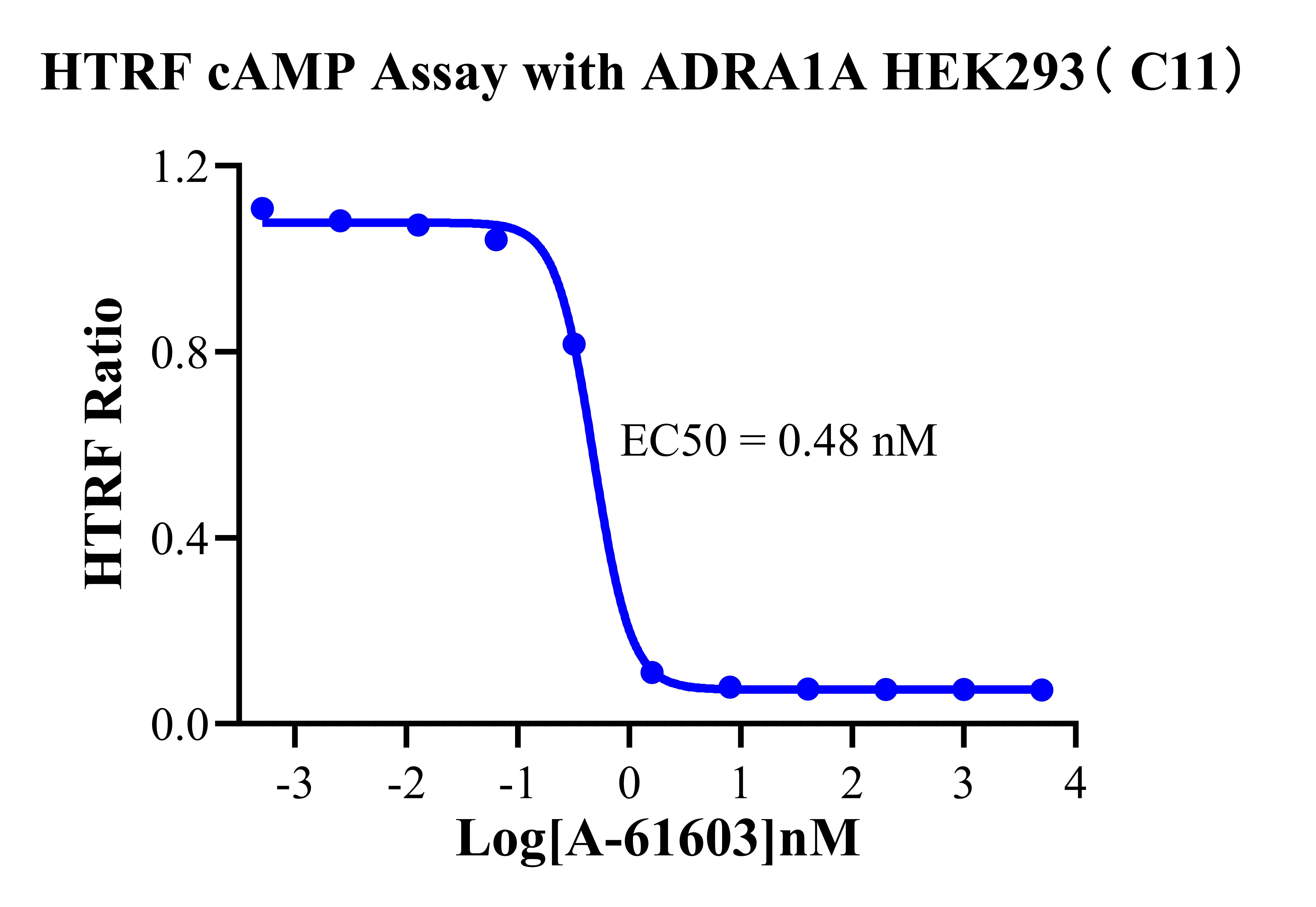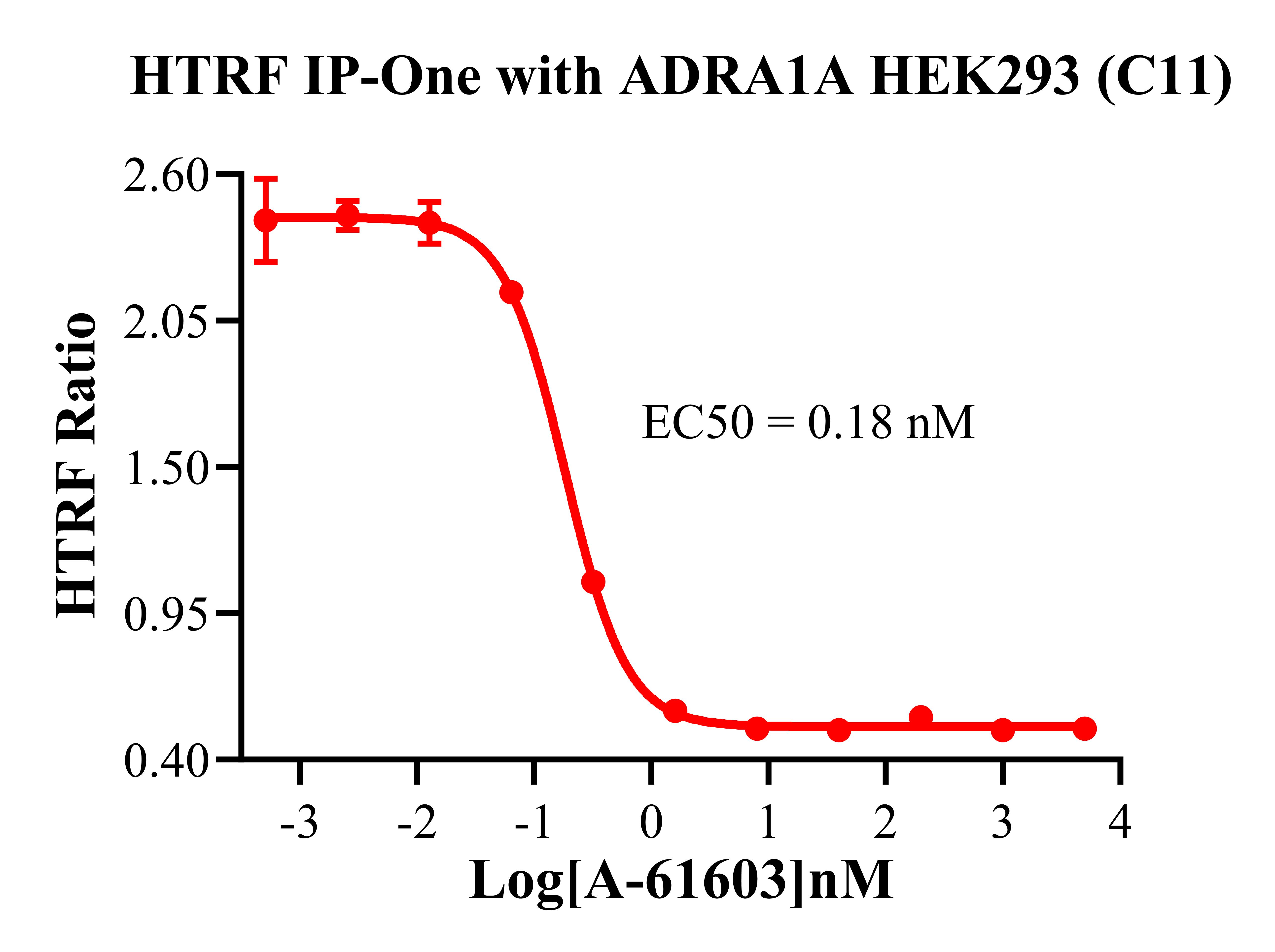 ADRA1A 还可以通过 Gq 蛋白的信号通路,调控 IP1 的升高。ADRA1A 与配体结合, 导致 Gαq 亚基的激活,触发 PLC-γ,从而产生两个第二信使:IP3 和 DAG,它们参与细胞 内钙动员。由于 IP3 在代谢上不稳定,因此测量通路激活的替代标志物 IP1 作为检测标准。