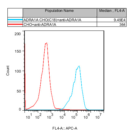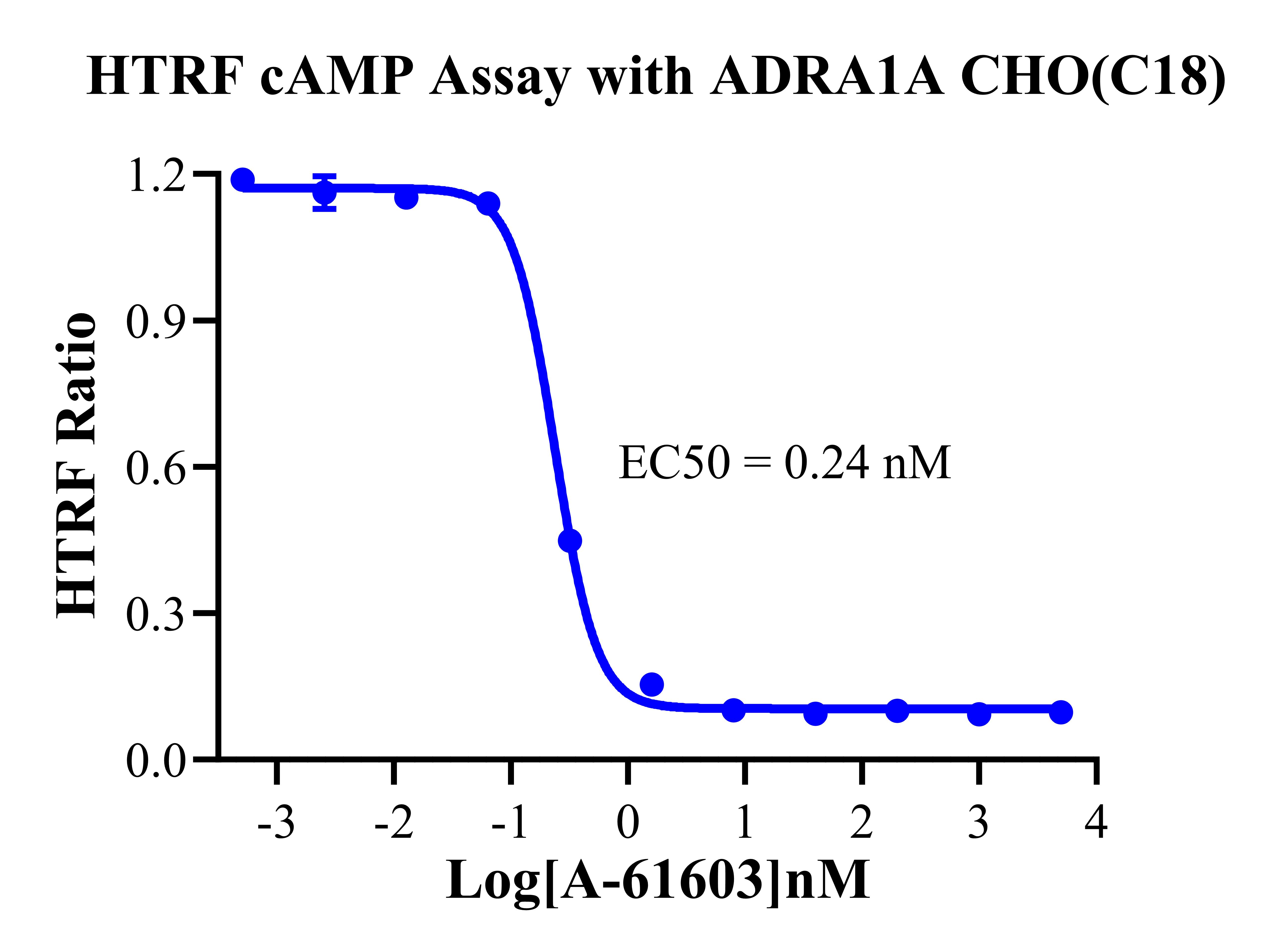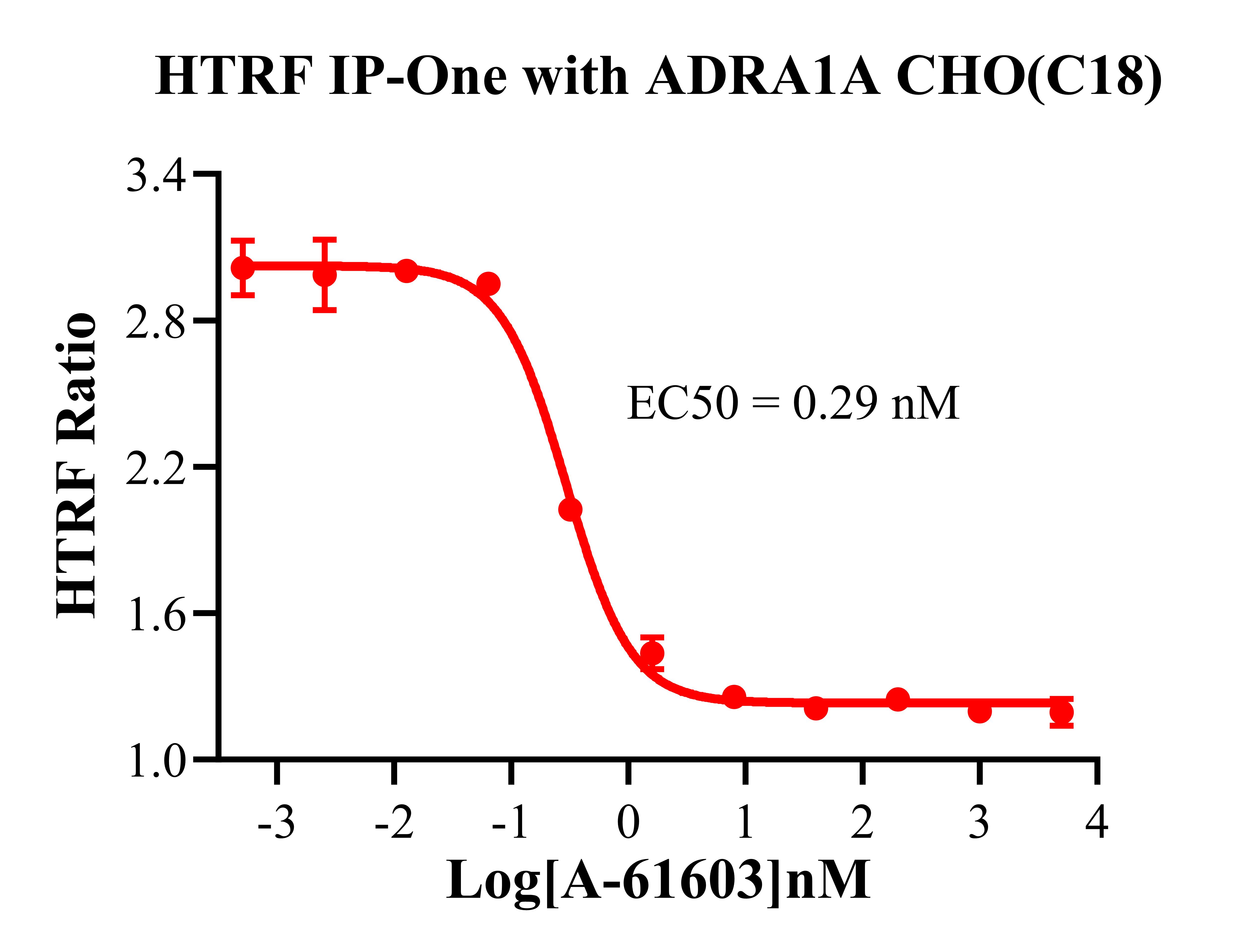 ADRA1A 还可以通过 Gq 蛋白的信号通路,调控 IP1 的升高。ADRA1A 与配体结合, 导致 Gαq 亚基的激活,触发 PLC-γ,从而产生两个第二信使:IP3 和 DAG,它们参与细胞内钙动员。由于 IP3 在代谢上不稳定,因此测量通路激活的替代标志物 IP1 作为检测标准。 Figure 1. ADRA1A CHO 细胞模型原理图