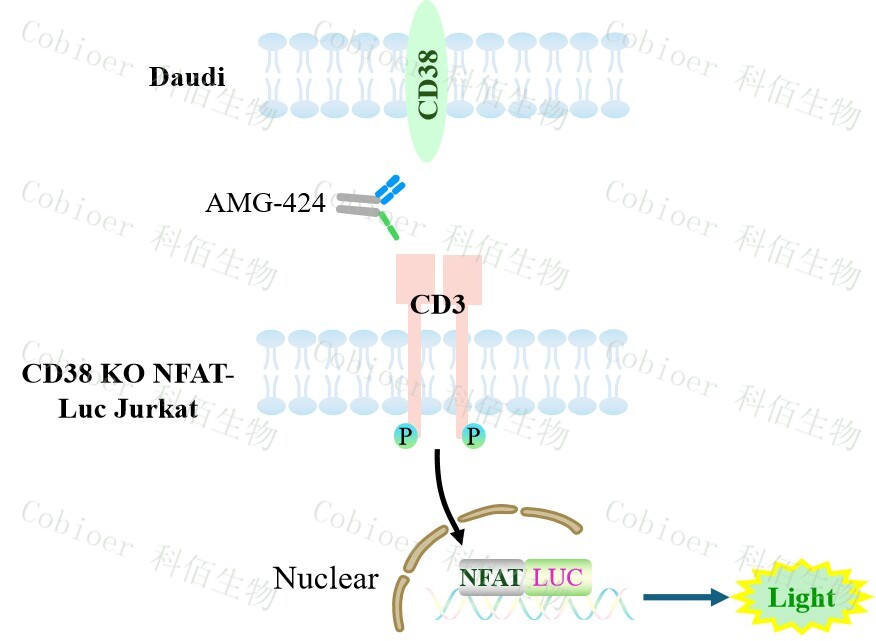 CD38 KO NFAT-Luc Jurkat Cell 报告基因药靶模型通过报告基因的信号反映 T 细胞受体 (TCR)信号通路的激活水平,原理见下图所示。![]() Figure 1. CD38 KO NFAT-Luc Jurkat Cell 细胞模型图  |