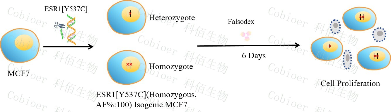 ESR1[Y537C](Homozygous,AF%:100) Isogenic MCF7 药靶细胞,通过基因编辑的方式将 ESR1 的 537 位氨基酸酪氨酸(Y)突变为半胱氨酸(C)。![]() Figure 1. ESR1[Y537C](Homozygous,AF%:100) Isogenic MCF7 原理示意图 |