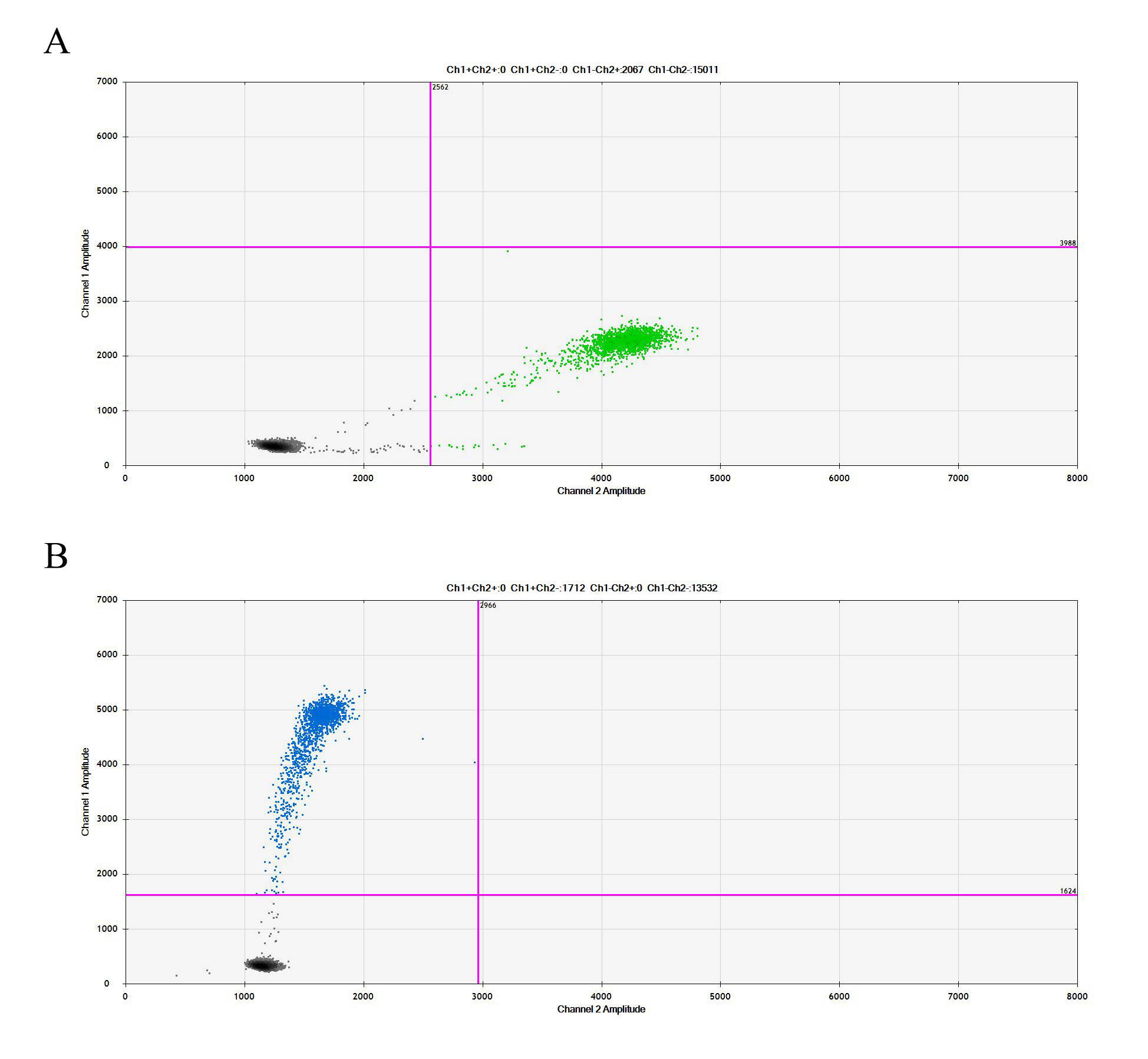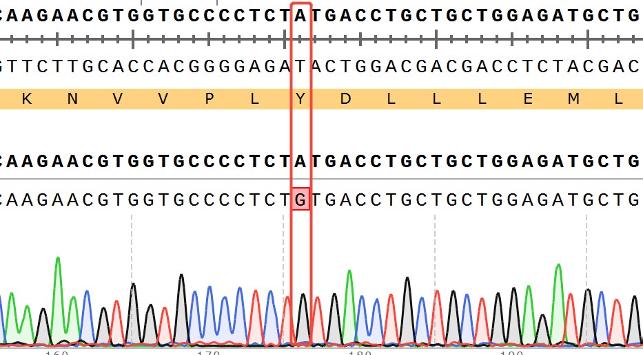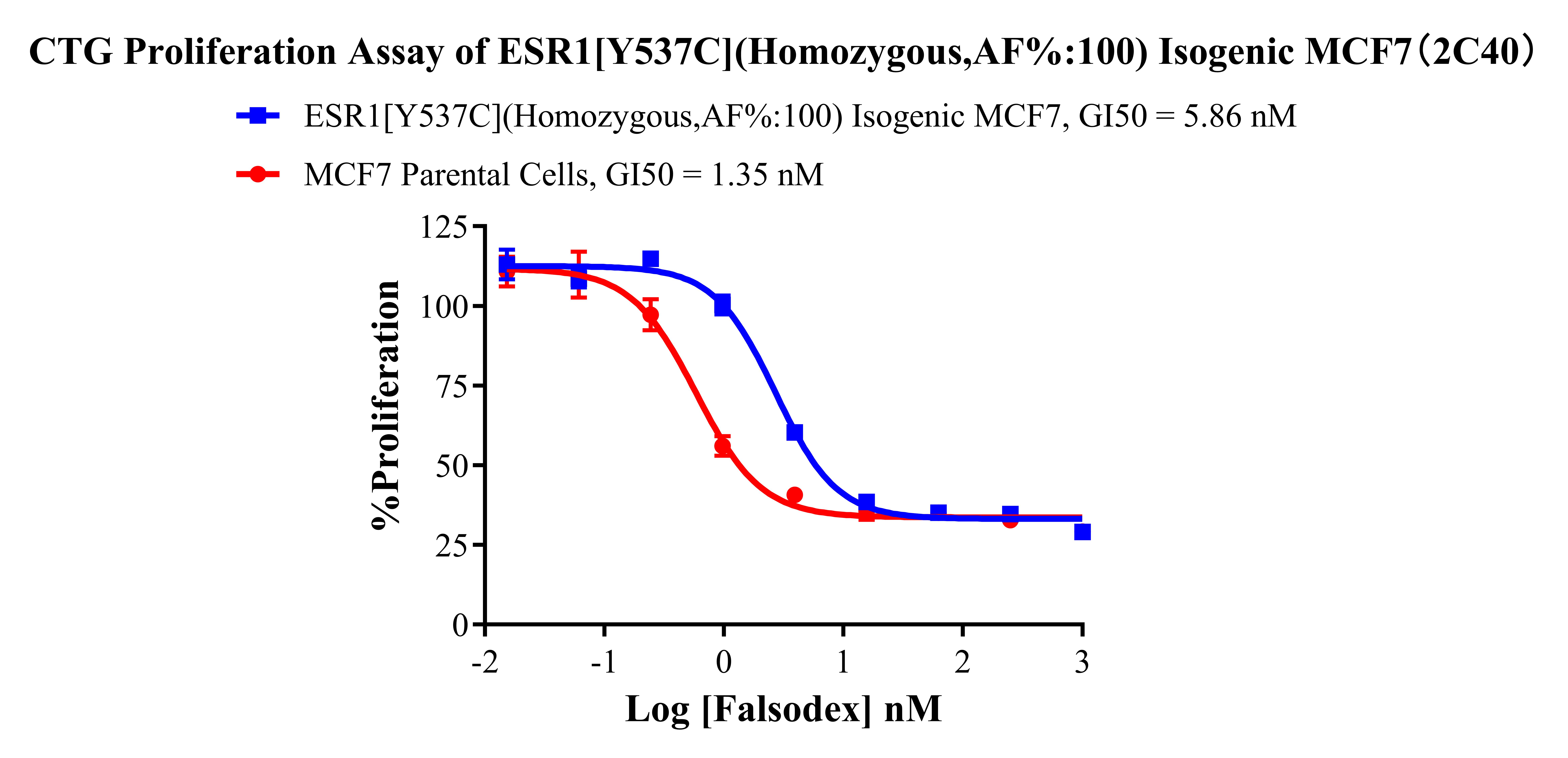 ![]() Figure 2. Sanger of ESR1[Y537C](Homozygous,AF%:100) Isogenic MCF7. ![]() Figure 3. A: MCF7 Parental Cell;B:ESR1[Y537C](Homozygous,AF%:100) Isogenic MCF7 通道2 蓝色微滴代表ESR1[Y537C]突变阳性,通道2 绿色微滴代表该位点为阴性野生型 ![]() Figure 4. CTG Proliferation Assay of ESR1[Y537C](Homozygous,AF%:100) lsogenic MCF7(2C40). |