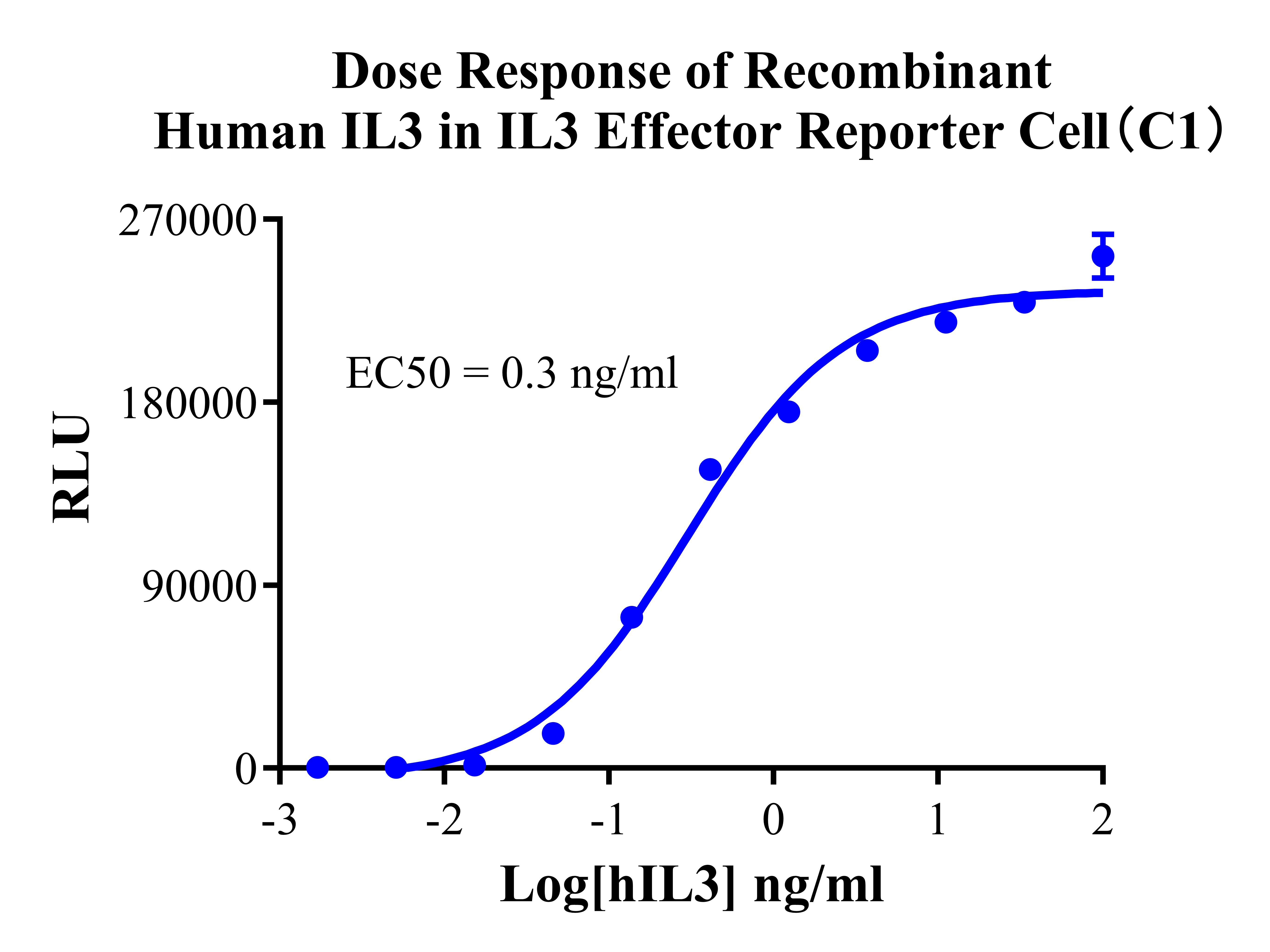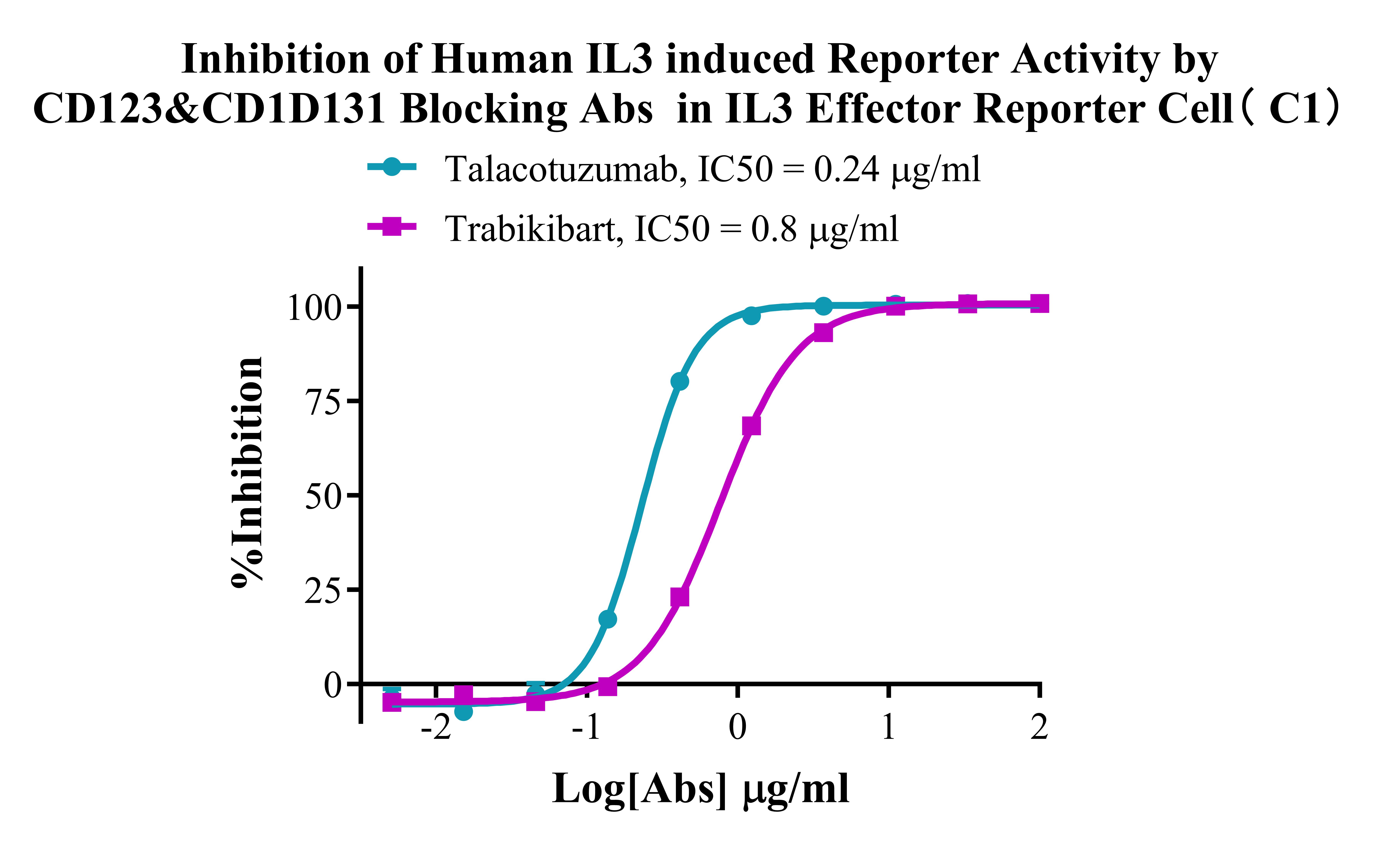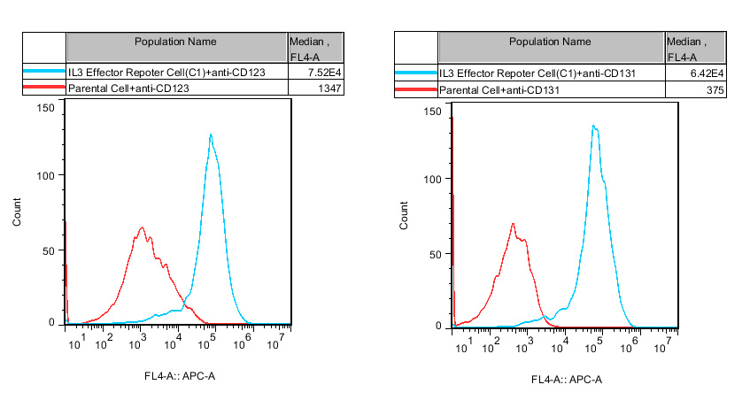 |  Figure 2. Recombinant IL3 Effector Reporter Cell stably expressing IL3.  Figure 3. Dose Response of Recombinant Human IL3 in IL3 Effector Reporter Cell(C1).  Figure 4. Inhibition of Human IL3 induced Reporter Activity by CD123&CD1D131 Blocking Abs in IL3 Effector Reporter Cell(C1). | |