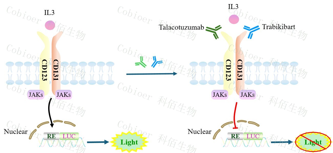 | IL3 Effector Reporter Cell 报告基因药靶模型很好的模拟了体内 IL3 的信号转导过程,原理见下图所示。  Figure 1. IL3 Effector Reporter Cell 细胞模型原理图 | |