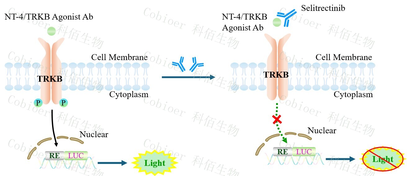 TRKB Effector Reporter Cell 报告基因药靶模型很好的模拟了体内 TRKB 的信号转导过程,原理见下图所示。![]() Figure 1. TRKB Effector Reporter Cell 模型原理图 |