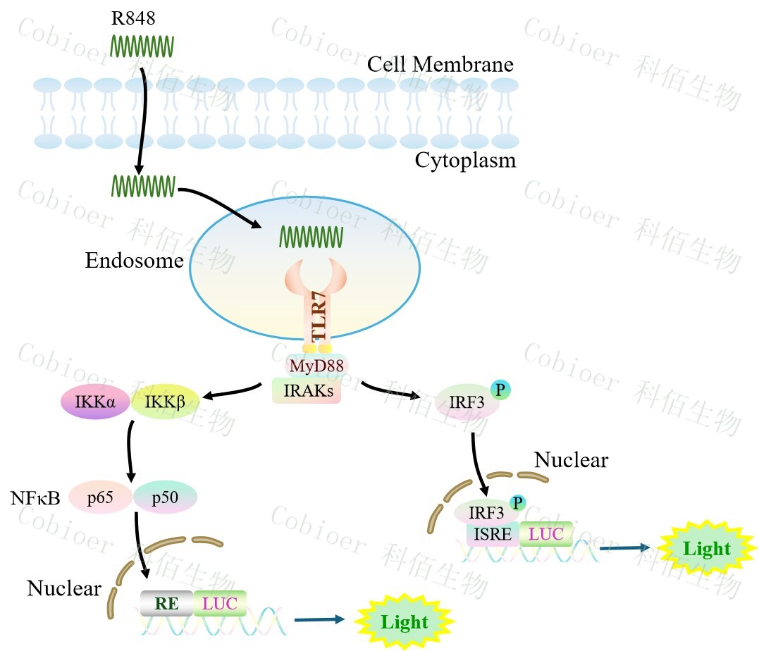 TLR7 NFκB&ISRE Dual Reporter Cell 报告基因药靶模型很好的模拟了体内 TLR7 的信号转导过程,原理见下图所示。![]() Figure 1. TLR7 NFκB&ISRE Dual Reporter Cell 细胞模型原理图 |