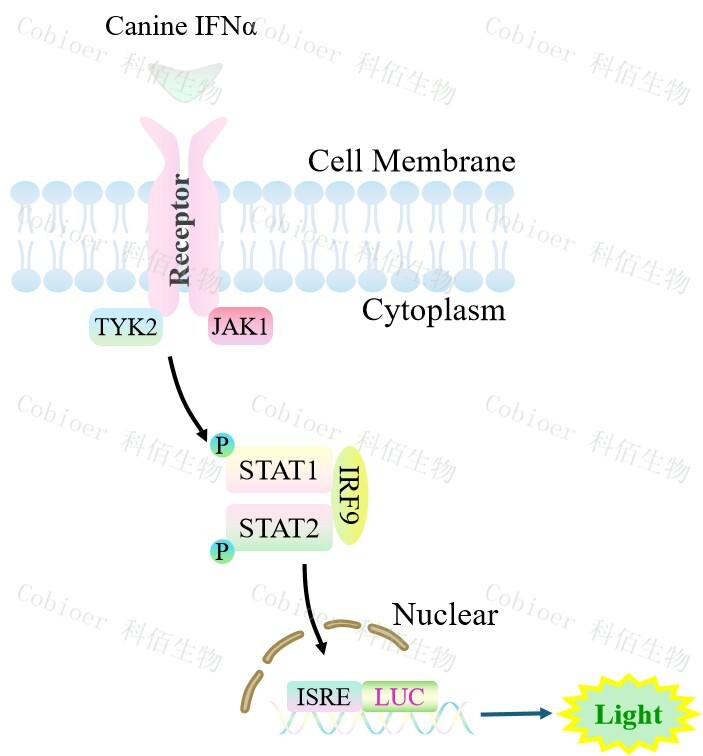 Canine IFNα&β Effector Reporter Cell 报告基因细胞,是由调控因子调控 并表达 Luc 荧光素酶报告基因的重组细胞。IFNα与受体结合,激活 ISRE 的原理见下图所示。![]() Figure 1. Canine IFNα&β Effector Reporter Cell 细胞模型原理图 |