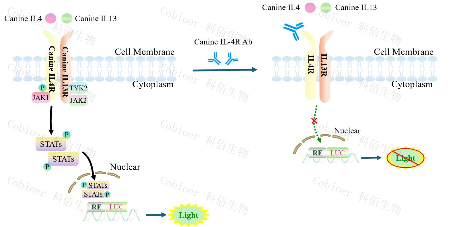 | Canine IL4/IL13 Dual Effector Reporter Cell 报告基因药靶模型很好的模拟了体内 IL4/IL13 的信号转导过程,原理见下图所示。  Figure 1. Canine IL4/IL13 Dual Effector Reporter Cell 细胞模型原理图 | |