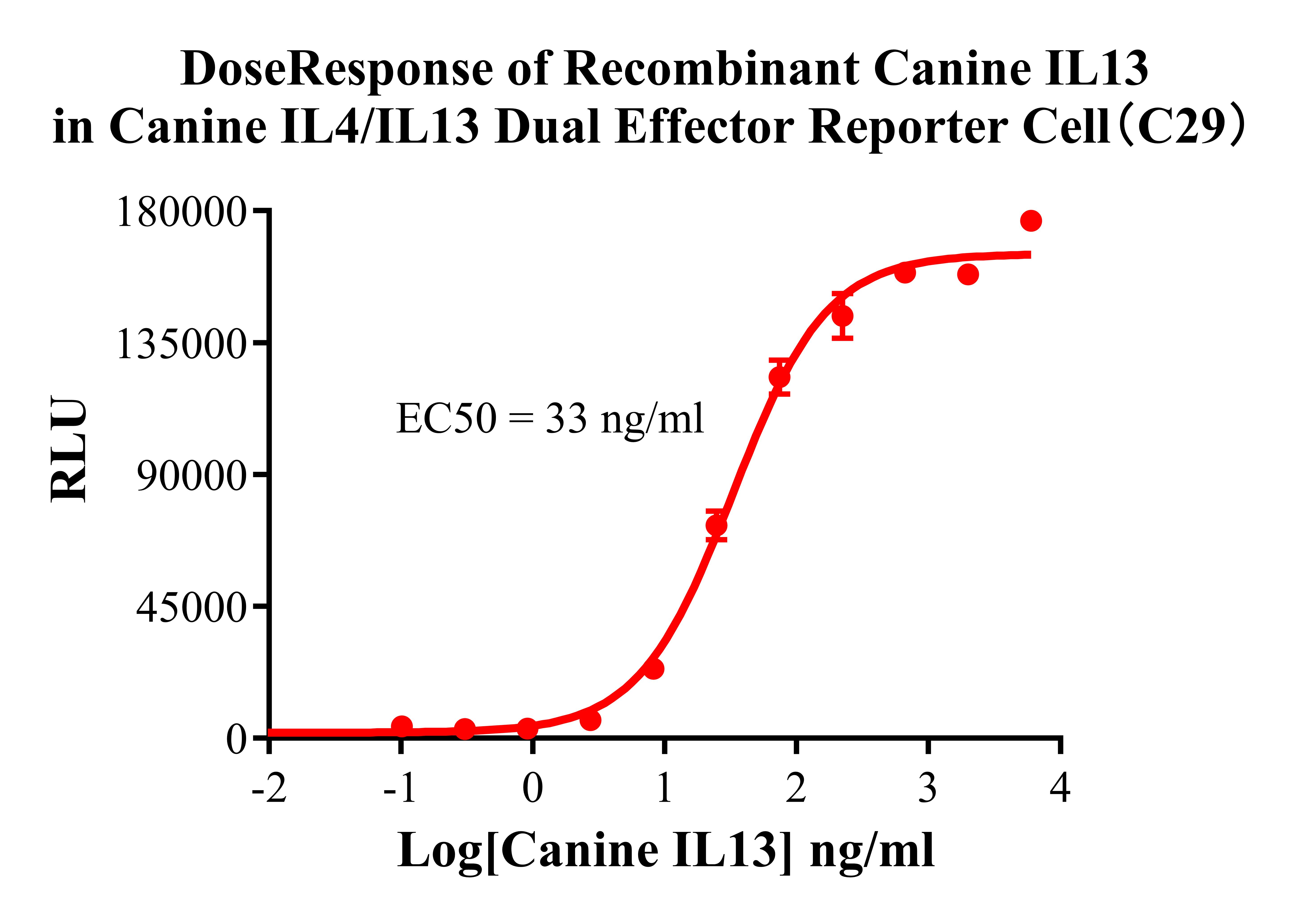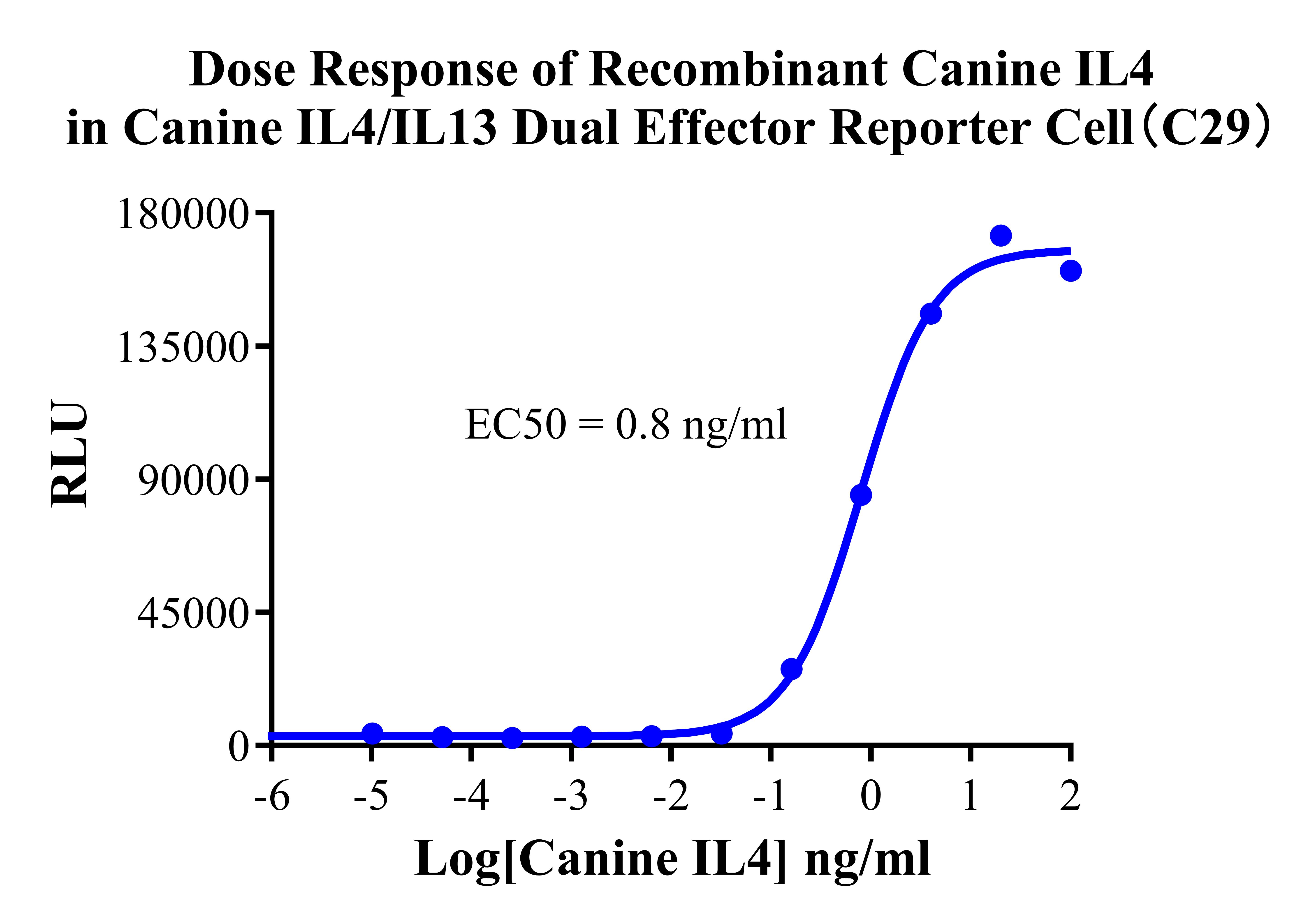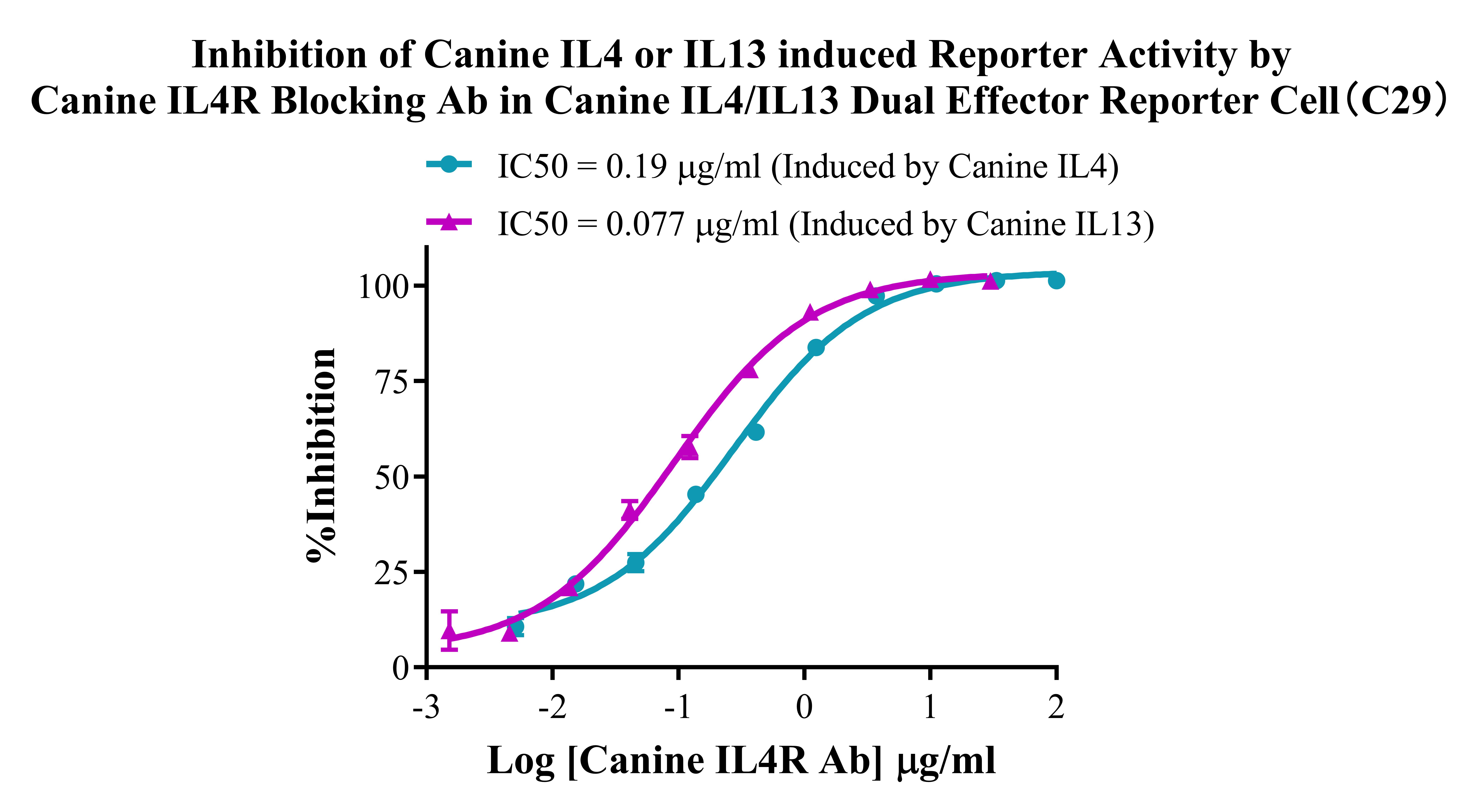 |  Figure 2. Dose Response of Recombinant Canine IL4 in Canine IL4/IL13 Dual Effector Reporter Cell(C29).  Figure 3. Dose Response of Recombinant Canine 1L13 in Canine IL4/IL13 Dual Effector Reporter Cell(C29).  Figure 4. Inhibition of Canine IL4 or IL3 induced Reporter Activity by Canine IL4R Blocking Ab in Canine IL4/IL13 Dual Effector Reporter Cell (C29). | |