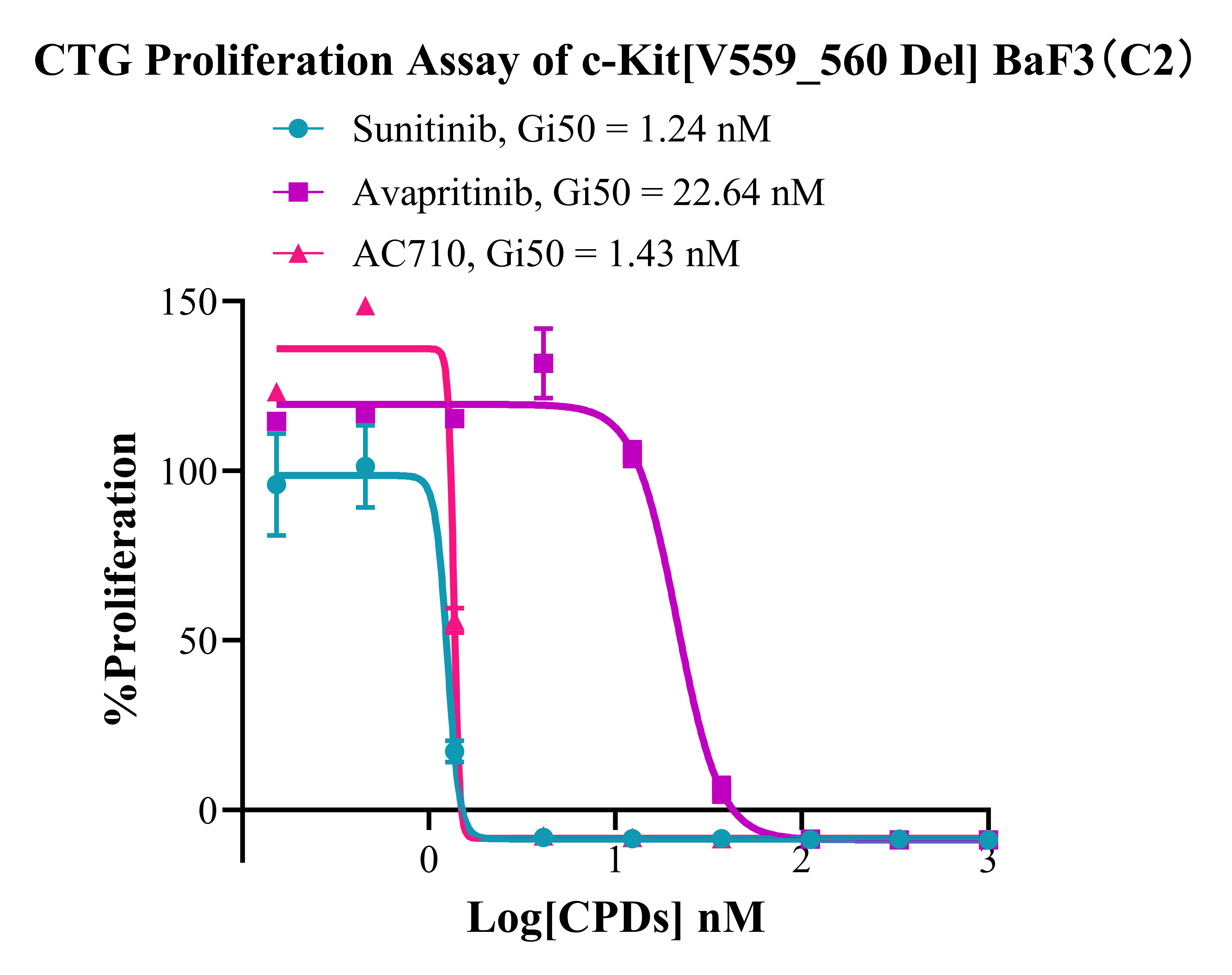 c-Kit[V559_560 Del] BaF3 药 靶 细 胞 , 通过转导缺失状态的 c- Kit[V559_560 Del] 基因到 BaF3 细胞系中,稳定表达人缺失形态下的 c-Kit[V559_560 Del] 基因。