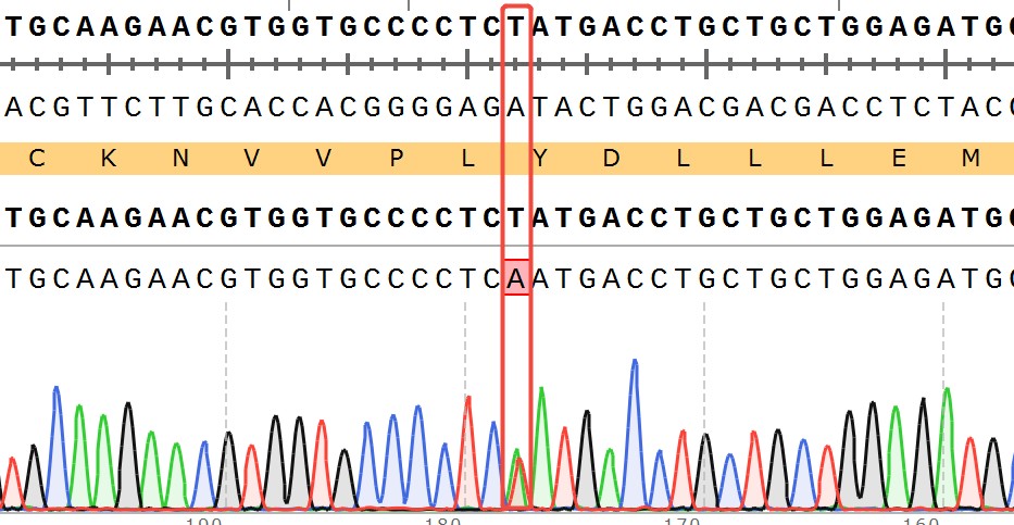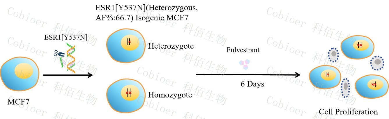 ESR1[Y537N](Heterozygous,AF%66.7) Isogenic MCF7 药靶细胞,通过基 因编辑的方式将 ESR1 的 537 位氨基酸酪氨酸(Y)突变为天冬酰胺(N)。![]() Figure 1. ESR1[Y537N](Heterozygous,AF%66.7) Isogenic MCF7 原理示意图 |