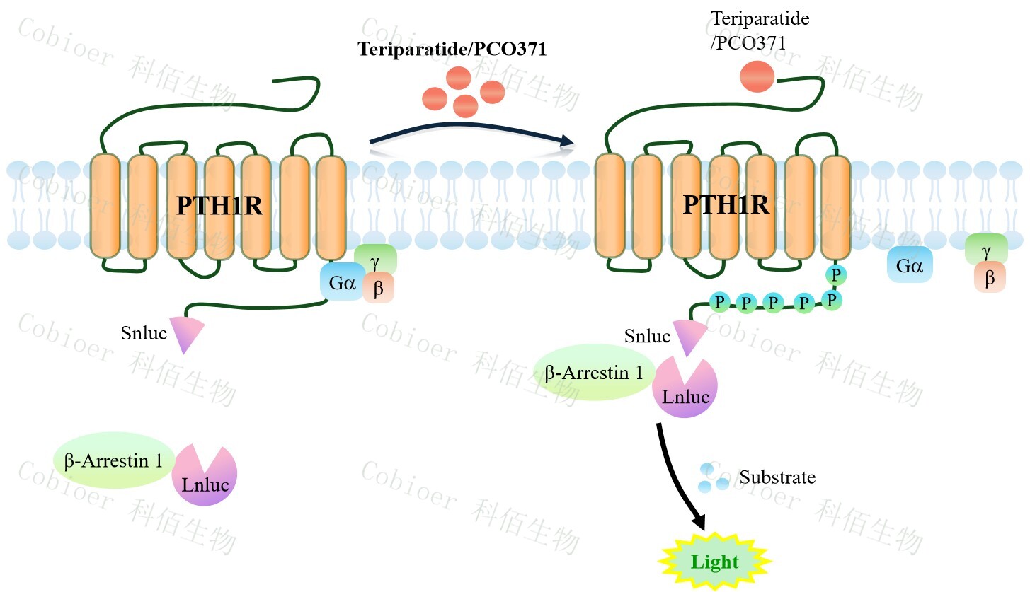 PTH1R β-Arrestin 1 CHO 报告基因药靶模型很好的模拟了体内 PTH1R/β-Arrestin 1 的信号转导过程,原理见下图所示。当缺乏配体刺激时,β-Arrestin 1 不与 PTH1R 结合,融合β- Arrestin 1 的荧光素酶处于失活构象,当 PTH1R 遭遇配体刺激时,融合荧光素酶报告基因 的β-Arrestin 1 被招募,使荧光素酶报告基因处于激活状态,加入其底物后发光信号增强。![]() Figure 1. PTH1R β-Arrestin 1 CHO 细胞模型原理图 |