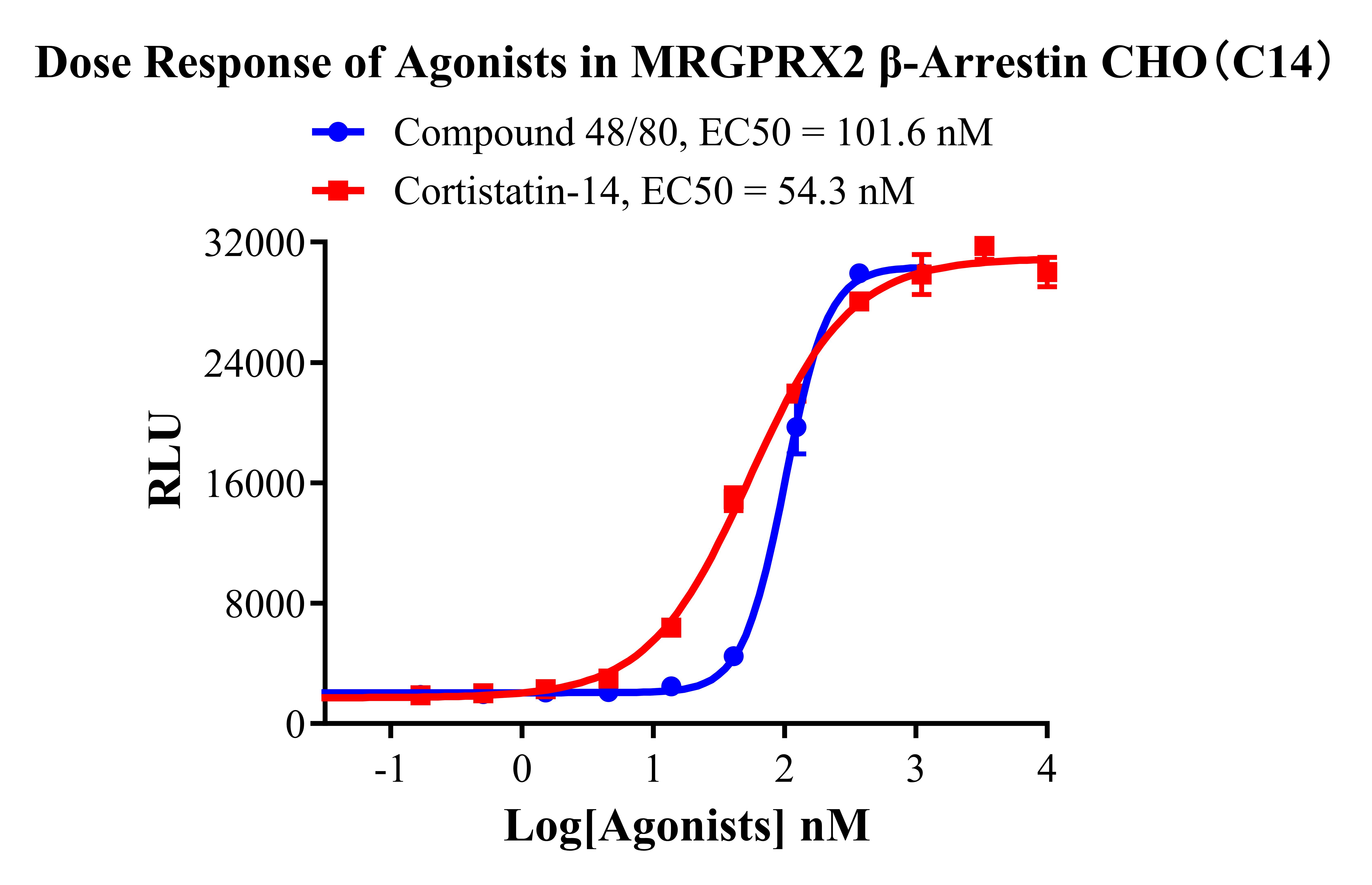 V. Representative Data![]() Figure 1. Recombinant MRGPRX2 β-Arrestin CHO stably expressing MRGPRX2. ![]() Figure 2. Dose Response of Agonists in MRGPRX2 β-Arrestin CHO(C14) . |