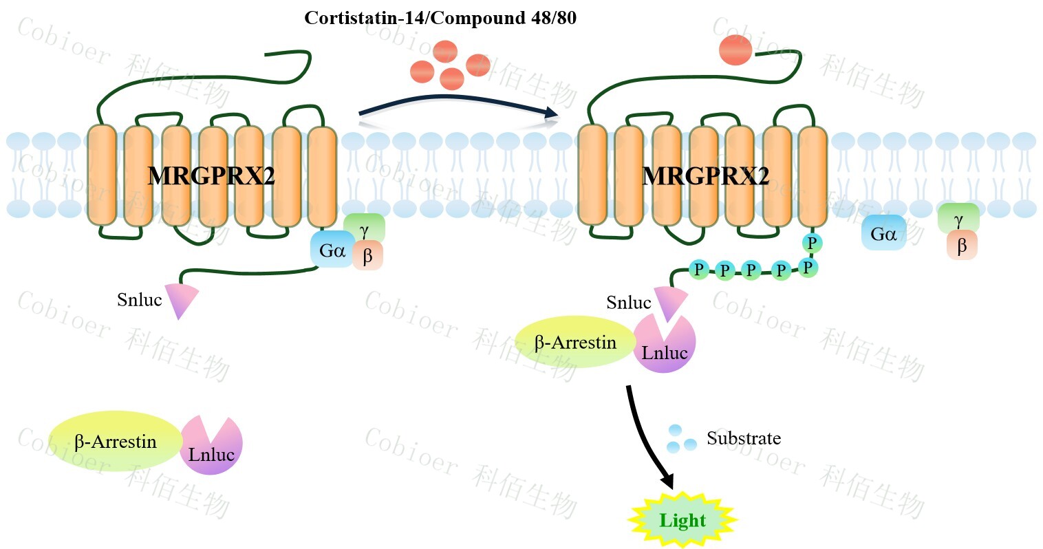 MRGPRX2 β-Arrestin CHO 报告基因药靶模型很好的模拟了体内 MRGPRX2/β-Arrestin 的信号转导过程,原理见下图所示。当缺乏配体刺激时,β-Arrestin 不与 MRGPRX2 结合, 融合β-Arrestin 的荧光素酶处于失活构象;当 MRGPRX2 遭遇配体刺激时,融合荧光素酶报 告基因的β-Arrestin 被招募,使荧光素酶报告基因处于激活状态,加入其底物后发光信号增 强。![]() Figure 1. MRGPRX2 β-Arrestin CHO 细胞模型原理图 |