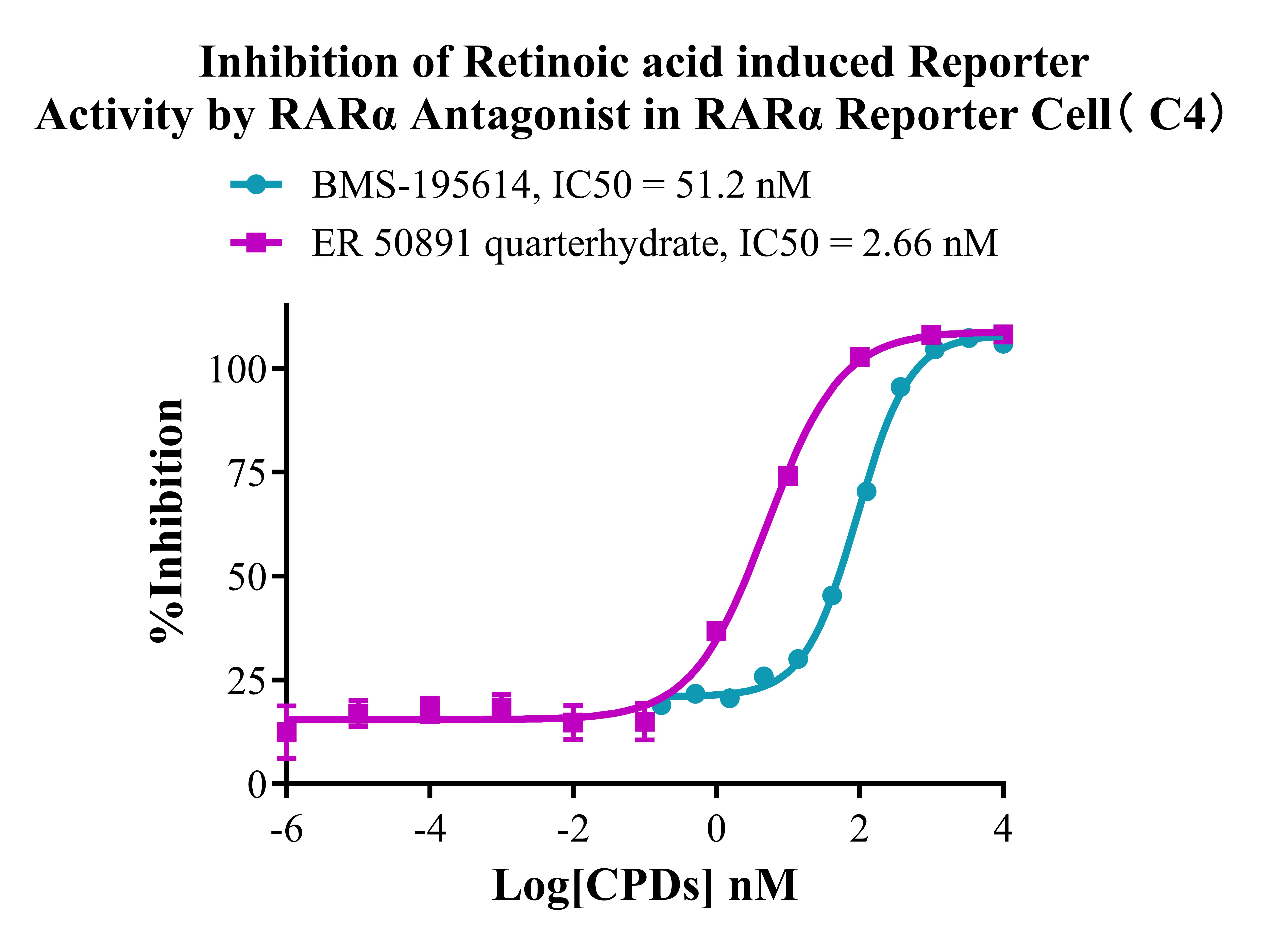 RARα Reporter Cell 报告基因细胞,在由调控因子调控并表达报告基因的重组细胞上,稳定表达人 RARα。Retinoic acid 是 RAR 核受体的天然激动剂,原理见下图所示。![]() Figure 1. RARα Reporter Cell 细胞原理示意图 |