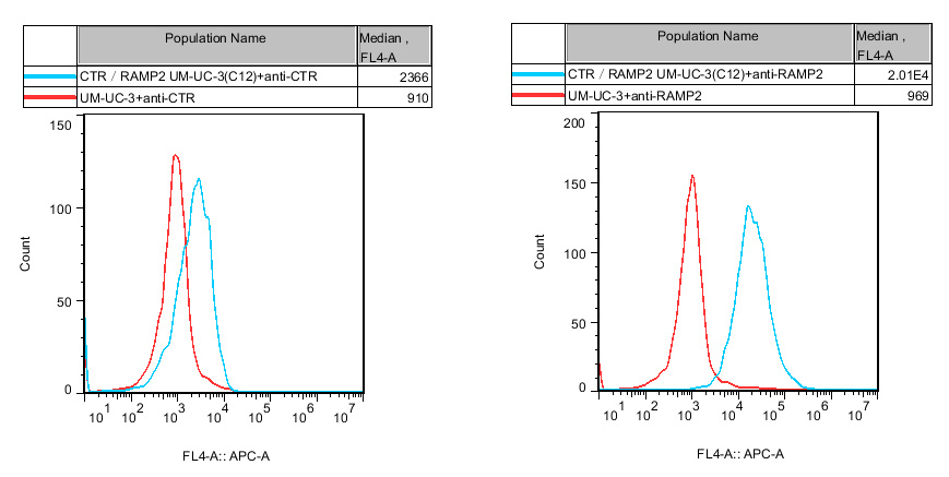 CTR&RAMP2 UM-UC-3 细胞药靶模型很好的模拟了体内 CTR&RAMP2 的信号转导过程,原理见下图所示。![]() Figure 1. CTR&RAMP2 UM-UC-3 细胞流式验证 CTR 和 RAMP2 的表达 |
