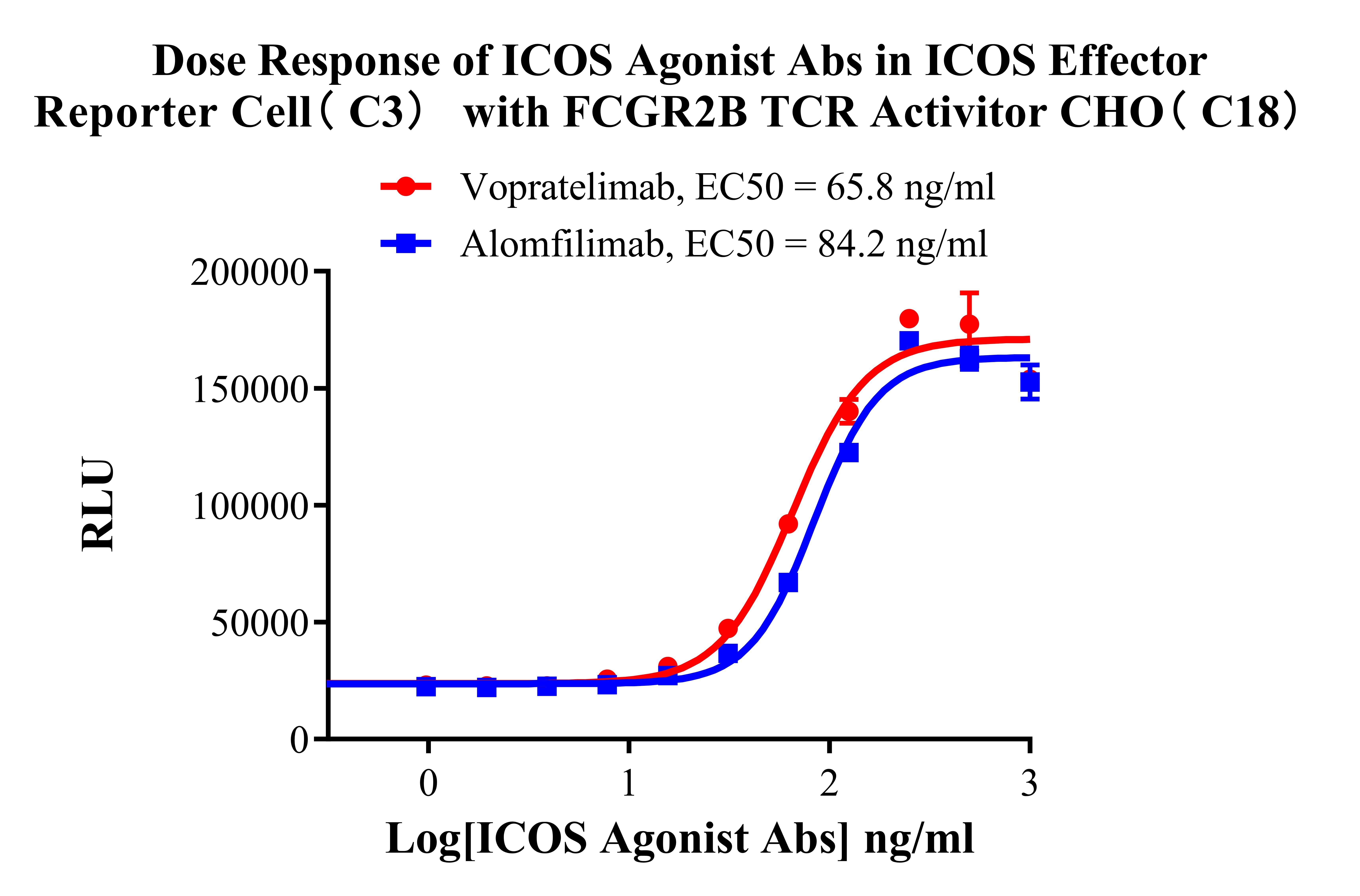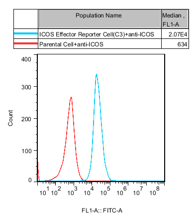 ![]() Figure 2. Recombinant ICOS Effector Reporter Cell stably expressing ICOS. ![]() Figure 3. Dose Response of ICOS Agonist Abs in ICOS Effector Reporter Cell(C3) with FCGR2B TCR Activitor CHO(C18).