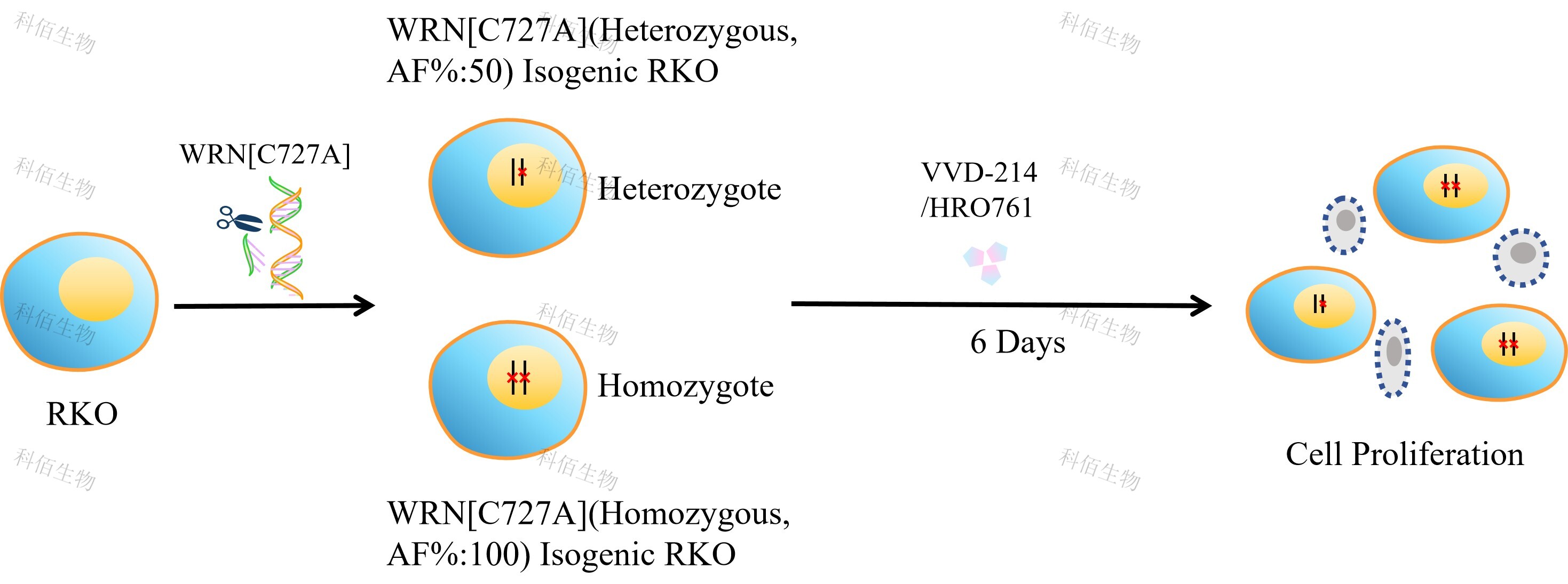 WRN[C727A](Homozygous,AF%:100) Isogenic RKO 药靶细胞,通过基因 编辑的方式将 WRN 的 727 位氨基酸胱氨酸(C)突变为丙氨酸(A)。![]() Figure 1. WRN[C727A](Homozygous,AF%:100) Isogenic RKO 原理示意图 |