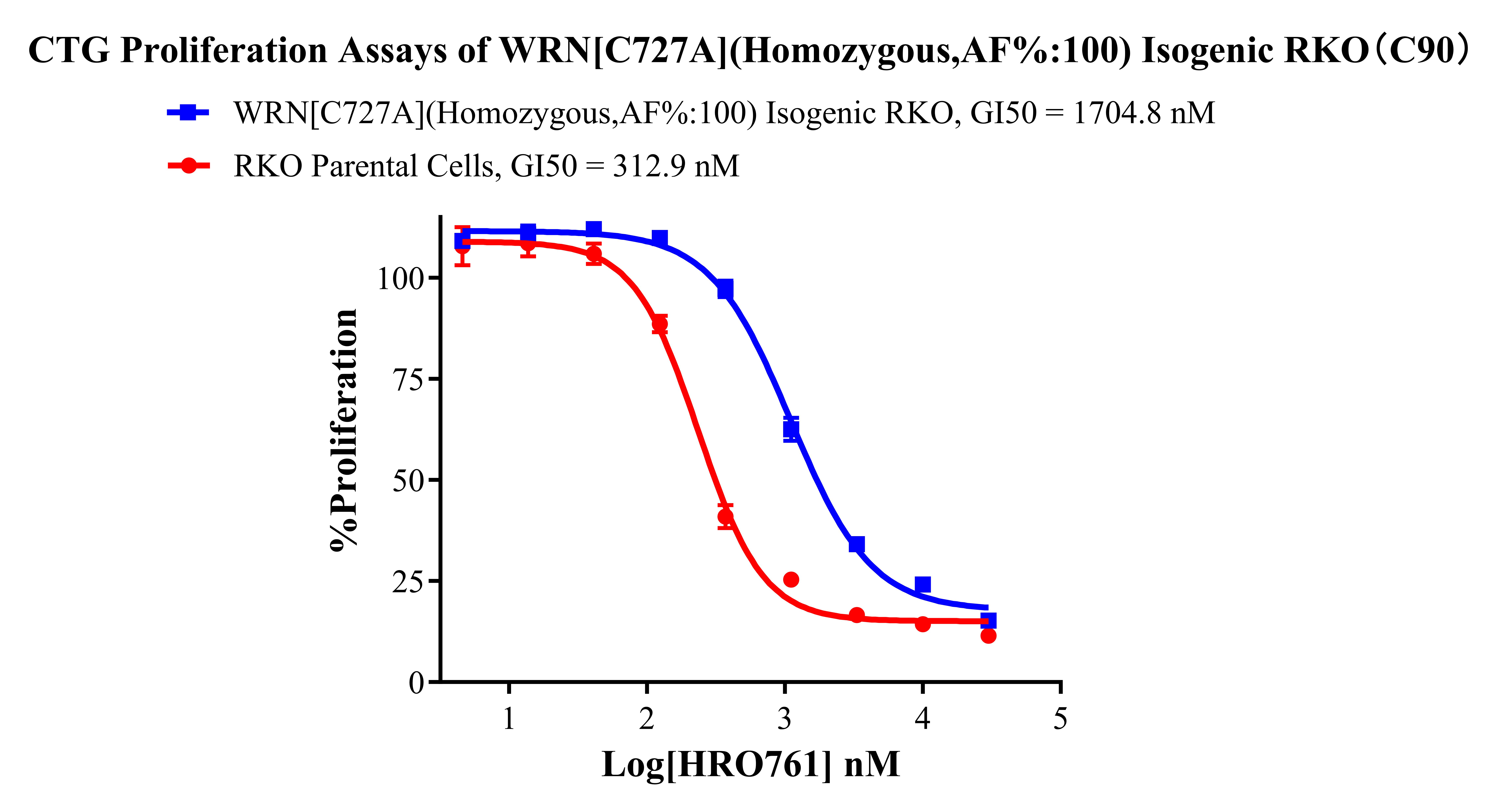 ![]() Figure 2. Sanger of WRN[C727A](Homozygous,AF%:100) Isogenic RKO. ![]() Figure 3. A:RKO Parental Cell;B:WRN[C727A](Homozygous,AF%:100) Isogenic RKO 通道2 蓝色微滴代表WRN[C727A]突变阳性,通道2 绿色微滴代表该位点为阴性野生型 ![]() Figure 4. CTG Proliferation Assays of WRN [C727A](Homozygous,AF%:100) Isogenic RKO(C90). ![]() Figure 5. CTG Proliferation Assays of WRN [C727A](Homozygous,AF%:100) Isogenic RKO(C90). |