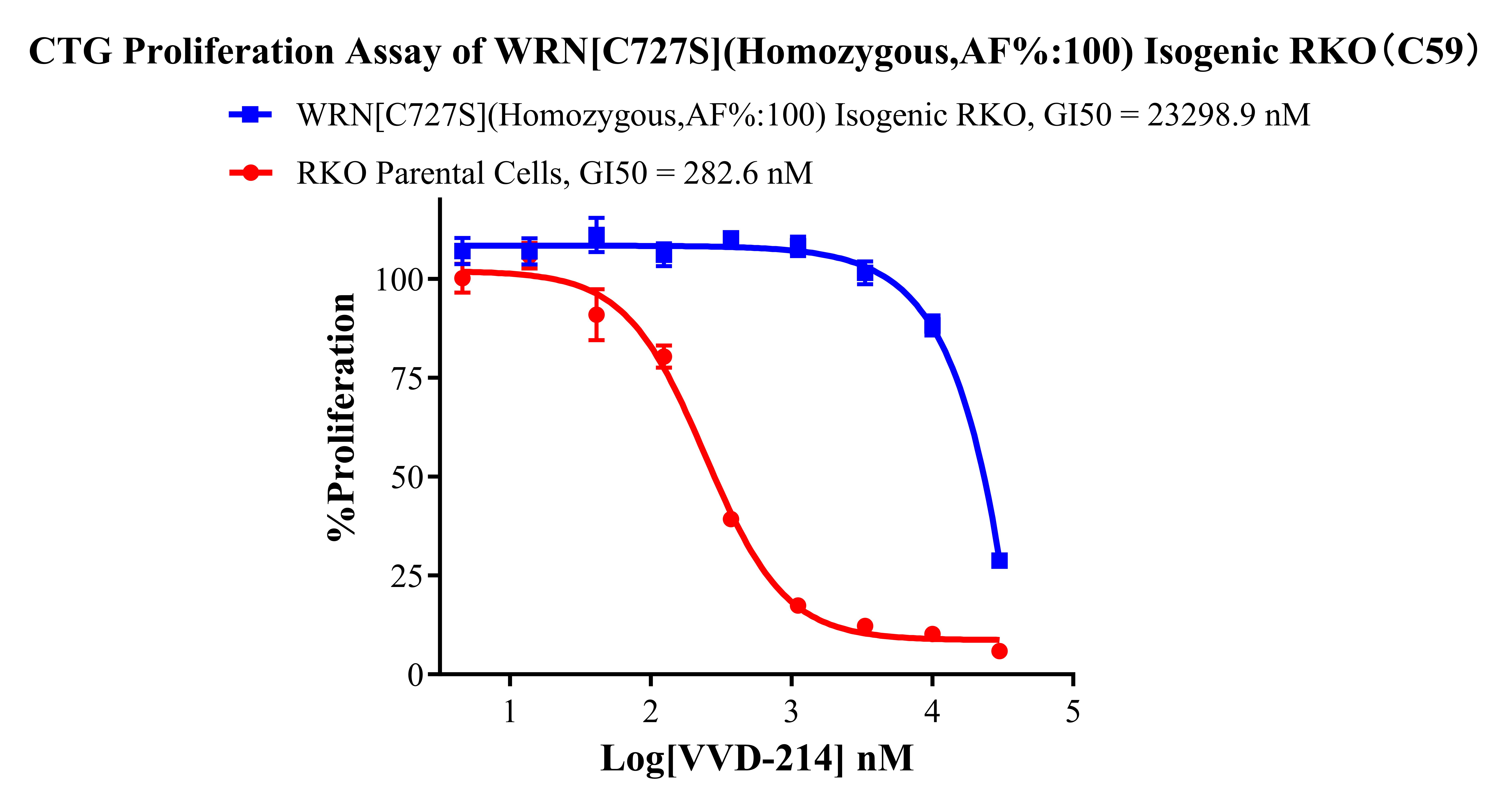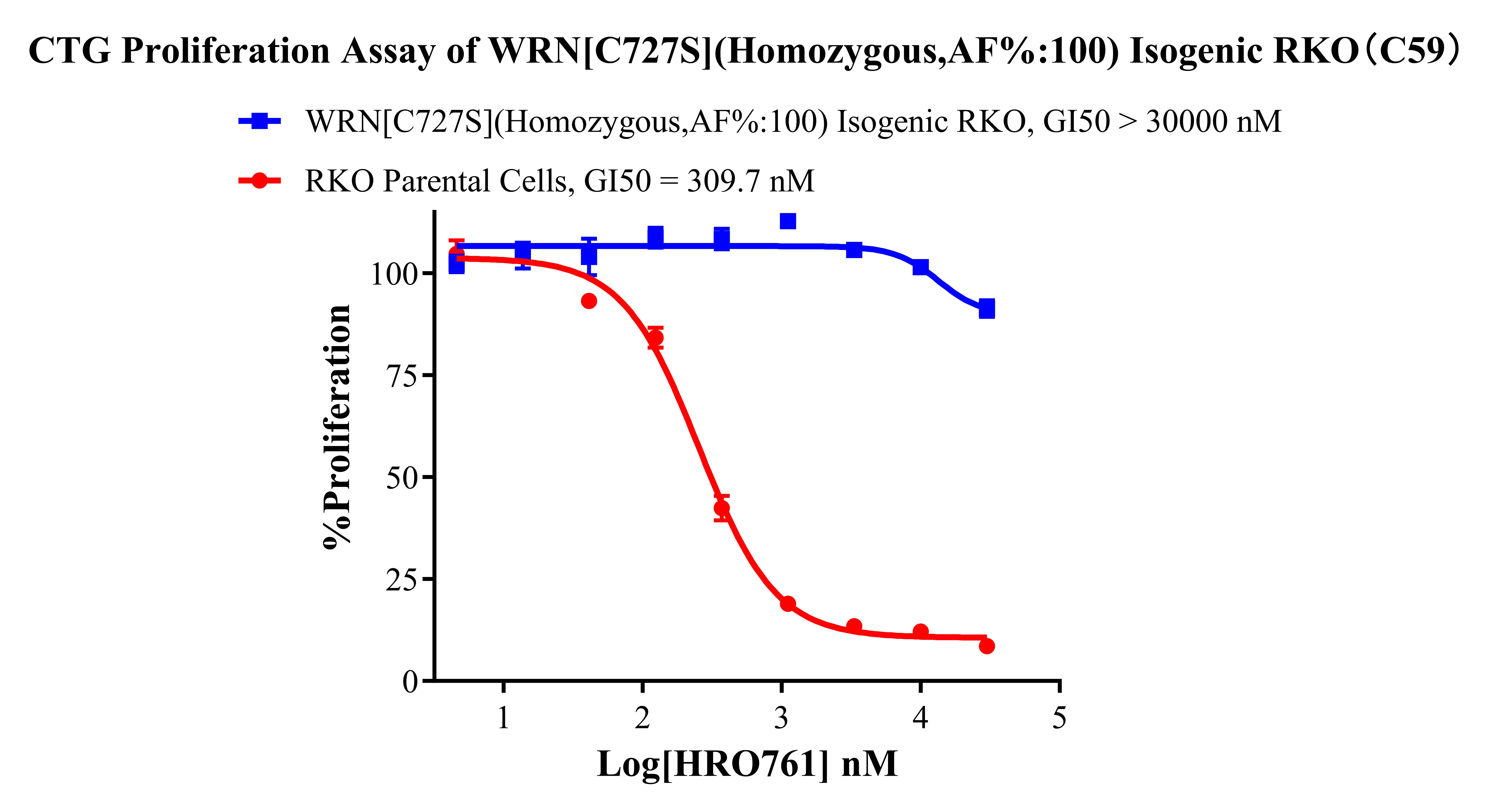 ![]() Figure 2. Sanger of WRN[C727S](Homozygous,AF%:100) Isogenic RKO. ![]() Figure 3. WRN[C727S](Homozygous,AF%:100) Isogenic RKO ddPCR结果 A:RKO Parental Cell;B:WRN[C727S](Homozygous,AF%:100) Isogenic RKO 通道1蓝色微滴代表WRN[C727S]突变阳性,通道2绿色微滴代表该位点为阴性野生型 ![]() Figure 4. CTG Proliferation Assay of WRN[C727S](Homozygous,AF%:100) Isogenic RKO(C59). ![]() Figure 5. CTG Proliferation Assay of WRN[C727S](Homozygous,AF%:100) Isogenic RKO(C59). |
