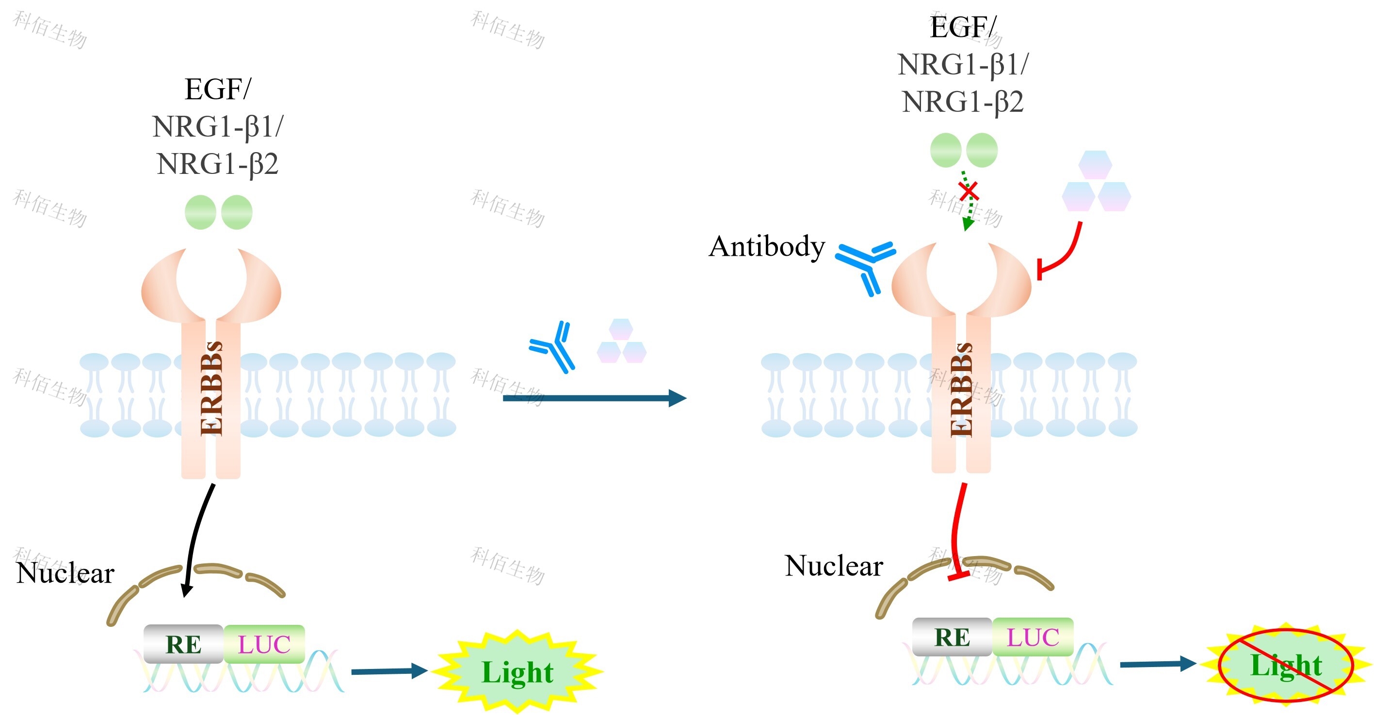 ERBB Family Effector Reporter Cell 报告基因药靶模型很好的模拟了体内 ERBB 家族的信号转导过程,原理见下图所示。![]() Figure 1. ERBB Family Effector Reporter Cell 细胞模型原理图 |