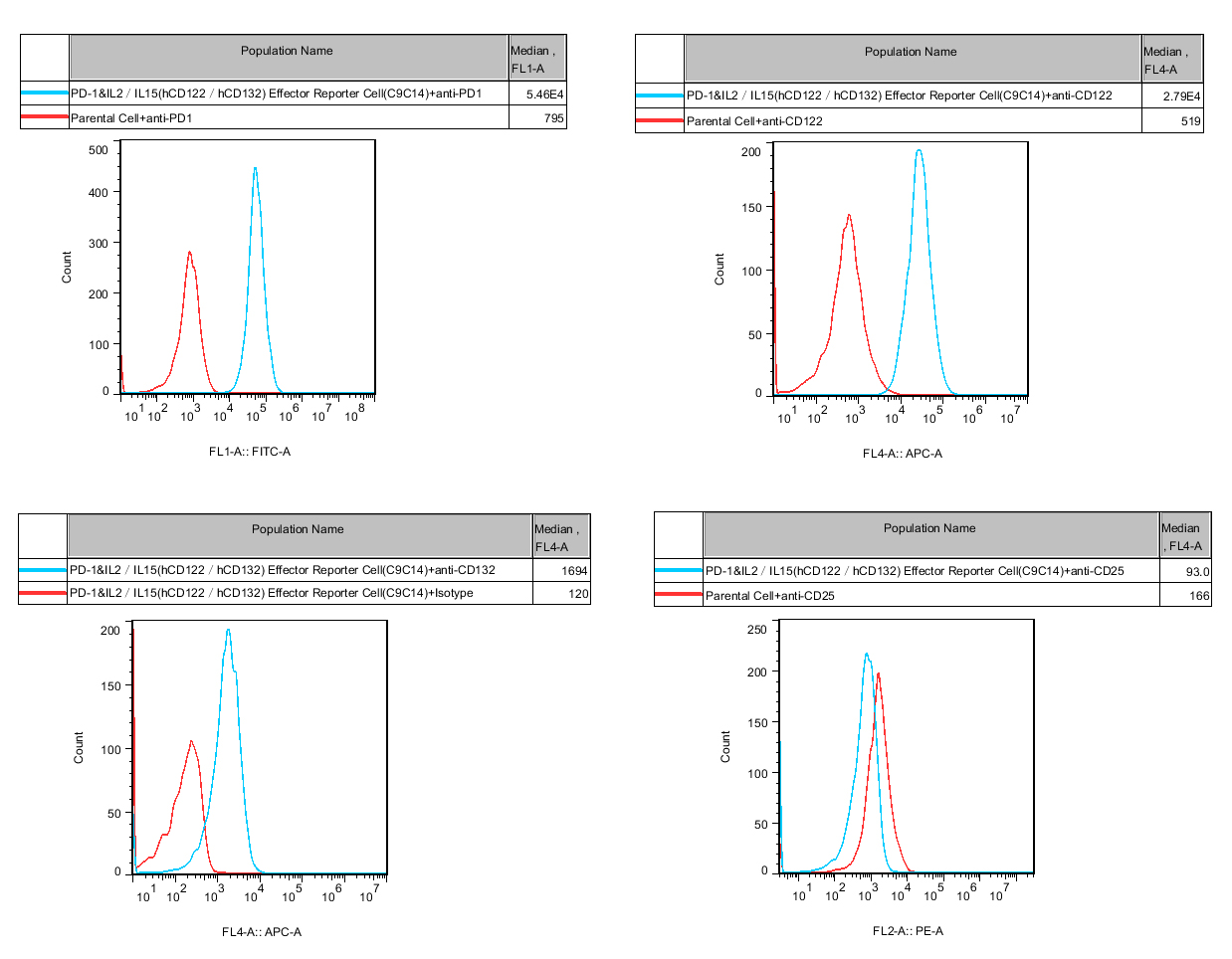 ![]() Figure 2. Recombinant PD-1&IL2/IL15(hCD122/hCD132) Effector Reporter Cell stably expressing PD1&CD122&CD132&CD25. ![]() Figure 3. Dose Response of Samples in PD-1&IL2/IL15(hCD122/hCD132) Effector Reporter Cell(C9C14). |