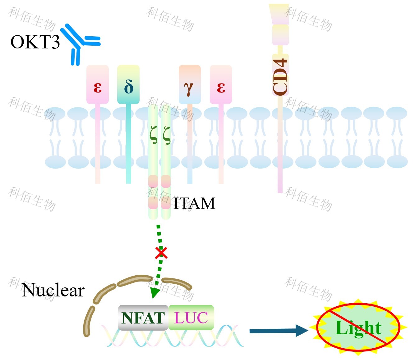 TCRαβ KO CD4+ NFAT-Luc Jurkat 报告基因药靶模型敲除 TCR 受体并过表达 CD4 以及 下游 NFAT 信号通路报告基因,原理见下图所示。![]() Figure 1. TCRαβ KO CD4+ NFAT-Luc Jurkat 细胞模型原理图 |