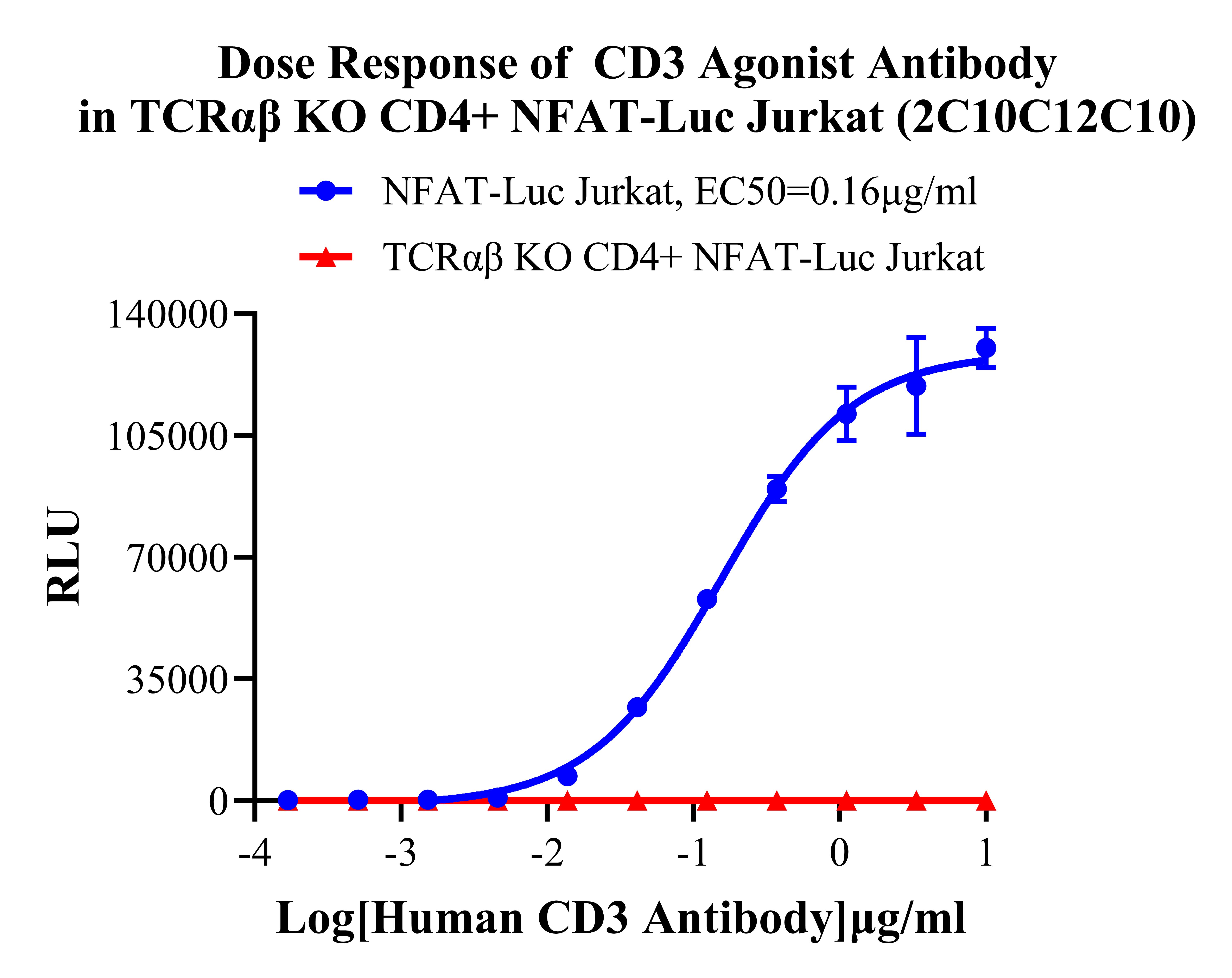 ![]() Figure 2. TCRαβ KO CD4+ NFAT-Luc Jurkat 细胞,在 TCRαβ KO NFAT-Luc Jurkat 细胞上过表达 CD4,见上图流式验证 CD4 的过表达效果和 TCRαβ的敲除效果。 ![]() Figure 3. Dose Response of CD3 Agonist Antibody in TCRαβ KO CD4+ NFAT-Luc Jurkat (2C10C12C10).