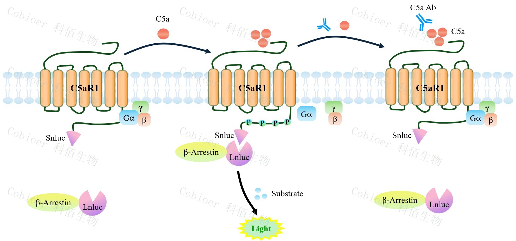 C5aR1 β-Arrestin CHO 报告基因药靶模型很好的模拟了体内 C5aR1/β-Arrestin 的信号转导过程,原理见下图所示。![]() Figure 1. C5aR1 β-Arrestin CHO 细胞模型原理图 |