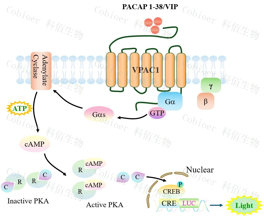 VPAC1 CRE-Luc HEK293 报告基因药靶模型很好的模拟了体内 VPAC1 的信号转导过程,原理见下图所示。![]() Figure 1. VPAC1 CRE-Luc HEK293 细胞模型原理图 |