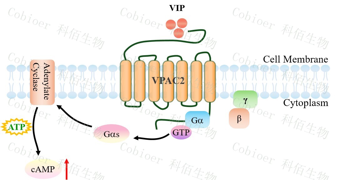 | PACAP/VIP 受体家族属于 B 类 G 蛋白偶联受体(GPCR),包含 PAC1R (PAC1)、 VPAC1R (VPAC1) 和 VPAC2R (VPAC2) 三个亚型,共同响应神经肽 PACAP(垂体腺苷酸 环化酶激活肽)和 VIP(血管活性肠肽)的调控,通过激活 Gs/cAMP-PKA 核心信号轴 (部分亚型偶联 Gq/PLC)广泛协调神经内分泌、代谢稳态与免疫调节。 VPAC2 受体(血管活性肠肽受体 2 型)作为 B 类 GPCR 的核心亚型,主要富集于下丘 脑视交叉上核(SCN)、胰腺β细胞、脂肪组织及骨细胞,以同等高亲和力结合 VIP 和 PACAP,通过 Gs/cAMP-PKA 通路调控代谢稳态与昼夜节律。VPAC2 的激活可同步 SCN 生物钟基因(如 Per2)振荡以维持睡眠-觉醒周期、促进胰岛素/胰高血糖素脉冲式分泌调 控血糖平衡、抑制破骨细胞分化并增强骨形成。 |