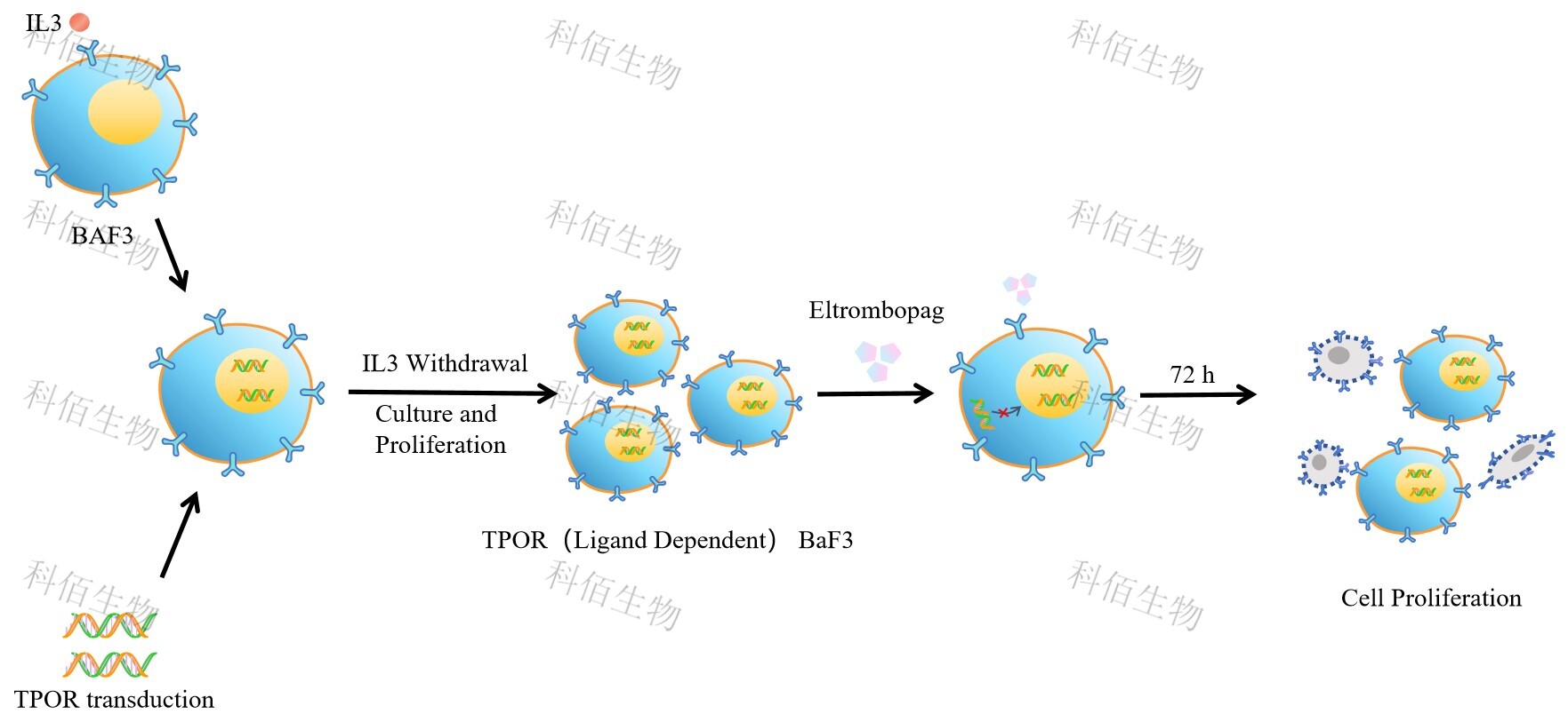 TPOR(Ligand Dependent) BaF3 药靶细胞,通过转导野生状态的 TPOR 基 因到 BaF3 细胞系中,稳定表达人野生形态下的 TPOR 基因。 BaF3(小鼠原 B 细胞)的生长和增殖需要 IL-3 的维持。通过引入各种表达激酶的基因, 能作为 BaF3 的驱动基因,让 BaF3 不再依赖 IL-3 而增殖,进而激酶基因成为 BaF3 增殖依赖的驱动基因,用于评估小分子药物对激酶的靶向抑制作用,原理及流程见下图所示。
