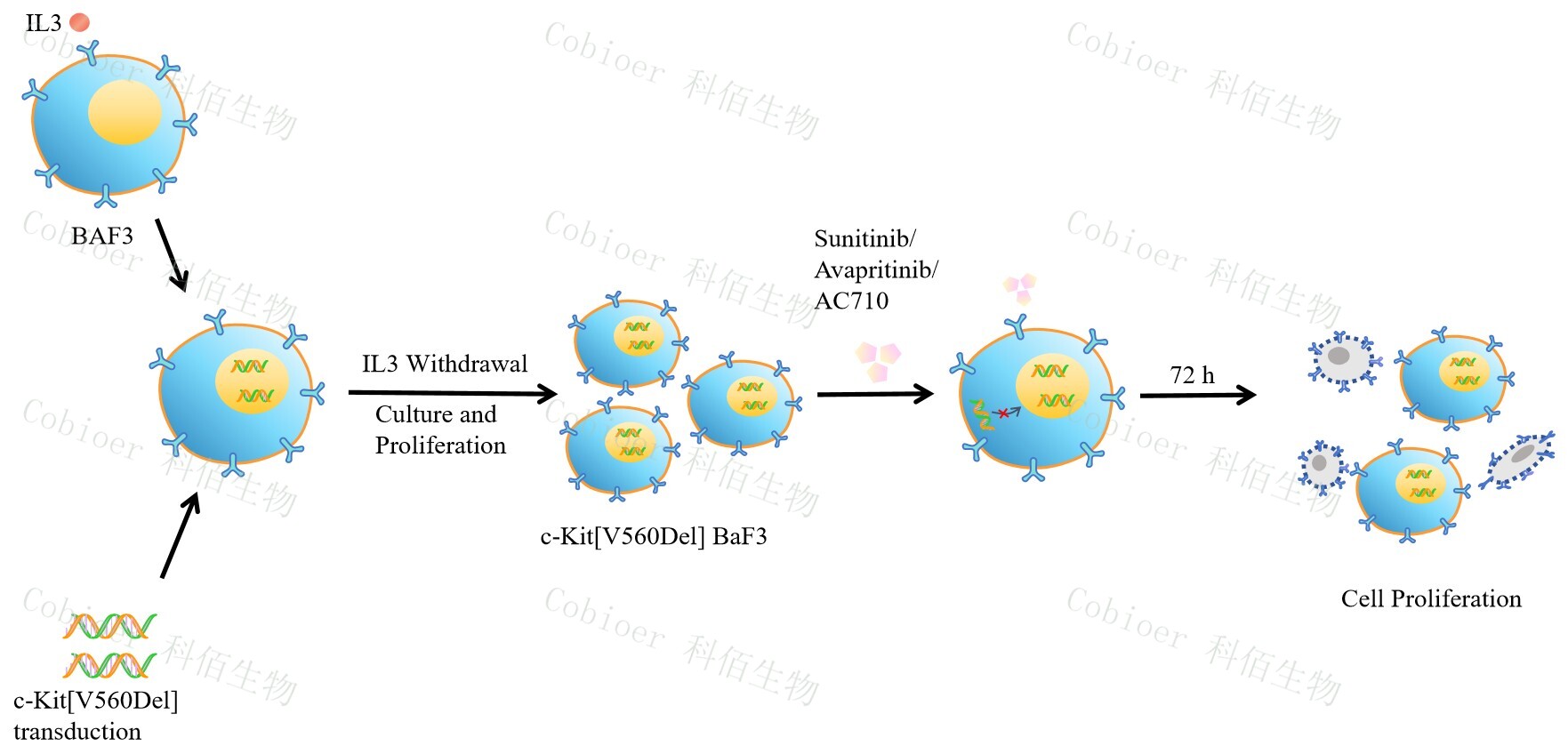 | c-Kit[V560Del] BaF3 药靶细胞,通过转导缺失状态的 c-Kit[V560Del] 基 因到 BaF3 细胞系中,稳定表达人缺失形态下的 c-Kit[V560Del] 基因。 BaF3(小鼠原 B 细胞)的生长和增殖需要 IL-3 的维持。通过引入各种表达激酶的基因, 能作为 BaF3 的驱动基因,让 BaF3 不再依赖 IL-3 而增殖,进而激酶基因成为 BaF3 增殖依 赖的驱动基因,用于评估小分子药物对激酶的靶向抑制作用,原理及流程见下图所示。 ![]() Figure 1. c-Kit[V560Del] BaF3 细胞的构建原理图 |