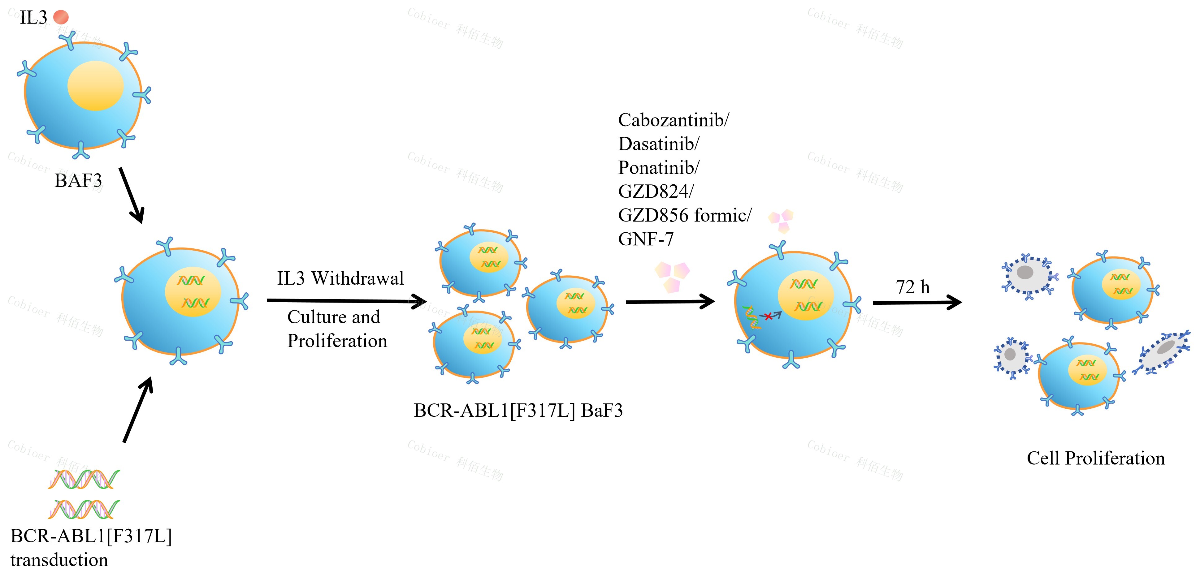 | BCR-ABL1[F317L] BaF3 药靶细胞 , 通过转导突变状态的 BCR- ABL1[F317L]基因到 BaF3 细胞系中,稳定表达人突变形态下的 BCR-ABL1[F317L]基因。 BaF3(小鼠原 B 细胞)的生长和增殖需要 IL-3 的维持。通过引入各种表达激酶的基因, 能作为 BaF3 的驱动基因,让 BaF3 不再依赖 IL-3 而增殖,进而激酶基因成为 BaF3 增殖依赖的驱动基因,用于评估小分子药物对激酶的靶向抑制作用,原理及流程见下图所示。 ![]() Figure 1. BCR-ABL1[F317L] BaF3 细胞的构建原理图 |