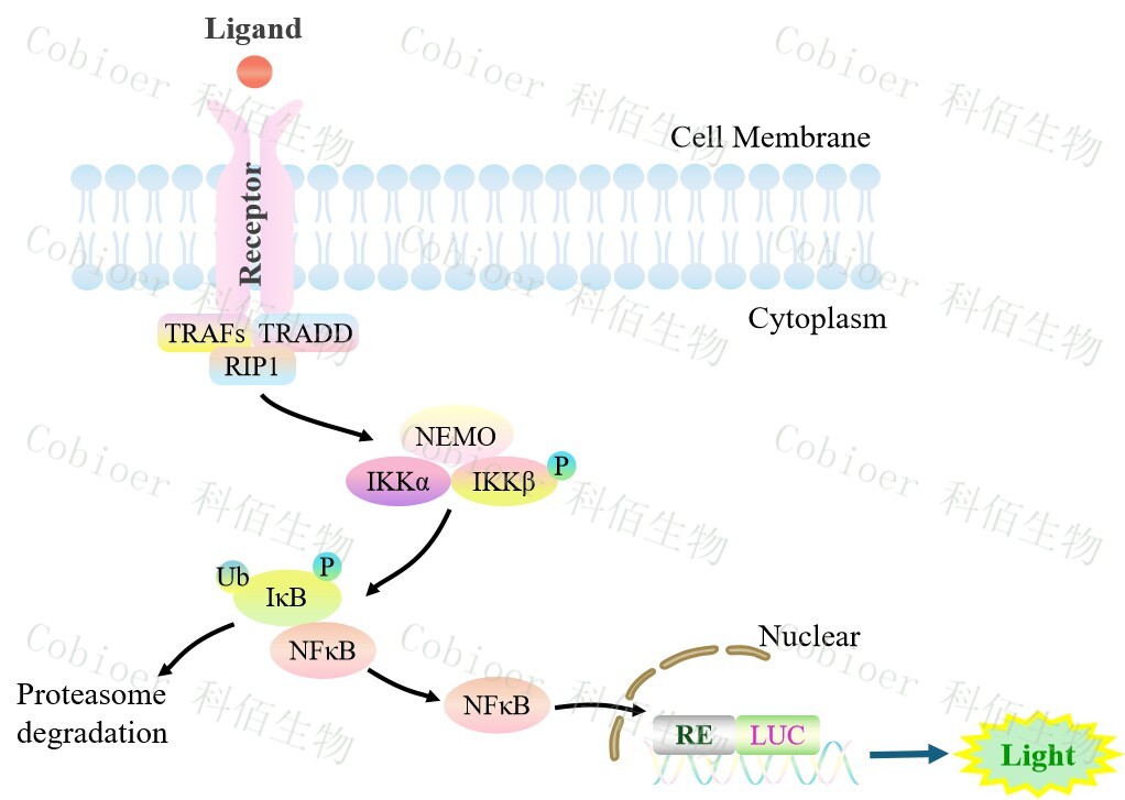 NFκB-Luc HEK293 报告基因细胞,是由 NFκB 调控并表达 Luc 荧光素酶 报告基因的 HEK293 细胞。配体与受体结合后,激活 NF-κB 的原理见下图所示。![]() Figure 1:NFκB-Luc HEK293 细胞模型原理图 |