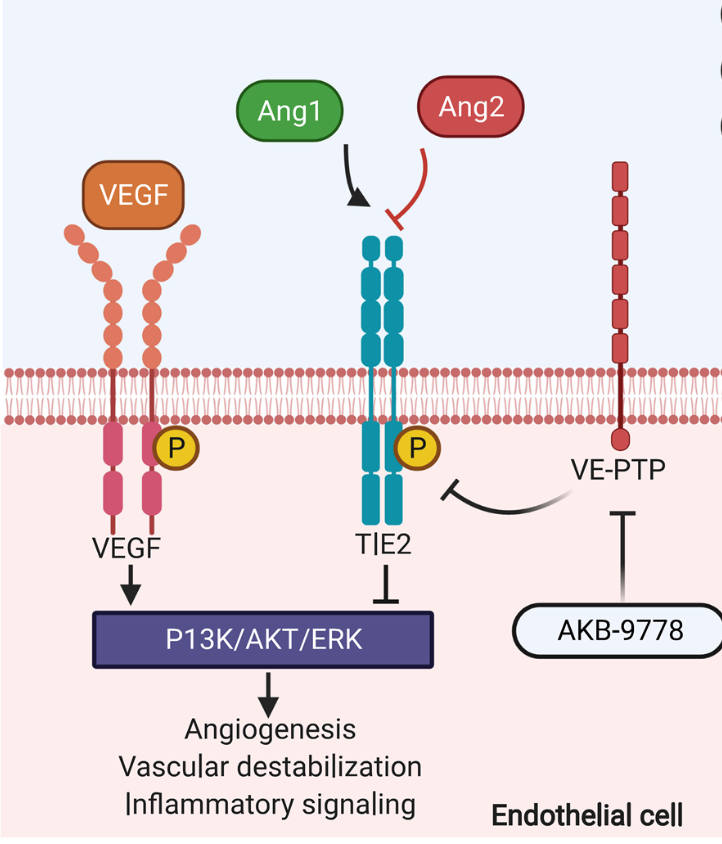 血管生成素蛋白家族由 血管生成素1(Ang1)、血管生成素2(Ang2)、血管生成素3(Ang3) 和血管生成素4(Ang4) 组成。Ang1和Ang2是Tie2的主要配体,Tie2是一种内皮细胞特异性受体酪氨酸激酶。Tie2在血管生成素激活后经历特异性亚细胞定位。这种定位有助于区分静止内皮和血管生成内皮之间的信号转导结果。在运动的血管生成内皮中,基质结合的Ang1与Tie2结合并将其定位于细胞-细胞外基质接触,并继续进行细胞迁移和增殖过程。在静止内皮中,Ang1/Tie2 信号转导将汇合内皮细胞上的Tie2转位到内皮细胞-内皮细胞连接处的簇中,并诱导促存活、内皮紧密连接稳定和抗炎信号。这主要是通过下游募集和激活PI3K以及随后的Akt磷酸化来实现的。Akt信号转导通过上调促存活分子(包括磷酸化内皮一氧化氮合酶(eNOS) 和存活素表达)来促进内皮细胞存活,同时抑制凋亡途径,例如 caspase-9 和 B 细胞淋巴瘤 2 (BCL2) 相关细胞死亡激动剂 (BAD)。