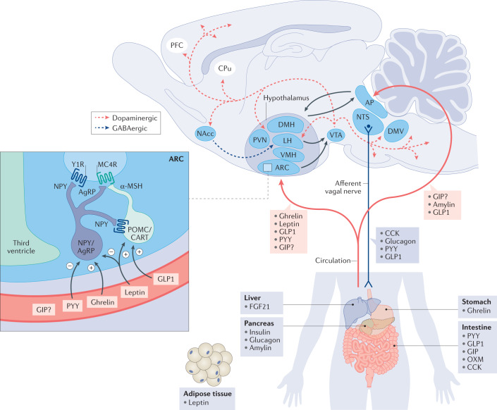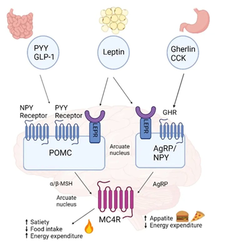 MC4R (黑皮质素4受体) 是黑皮质素受体家族成员之一,其家族属于视紫红质样A类GPCR,成员还包括:MC1R、MC2R、MC3R和MC5R。黑皮质素受体 (MC1R-MC5R) 位于多种细胞类型上,并遍布大多数身体系统。MC4R是中枢黑皮质素系统的重要组成部分,主要在下丘脑室旁核(PVH)中表达,是一种A类GPCR。在高能量平衡状态下,阿片黑皮质素原 (POMC) 神经元释放多肽MC4R激动剂-α-黑素细胞刺激激素(α-MSH)。α- MSH与MC4R结合会激活MC4R信号传导,抑制食欲和食物摄入。在低能量平衡状态下,下丘脑室旁核中释放AgRP (agouti-related peptide)。AgRP作为MC4R与α- MSH结合的竞争性拮抗剂,也是MC4R反向激动剂,抑制MC4R信号传导。