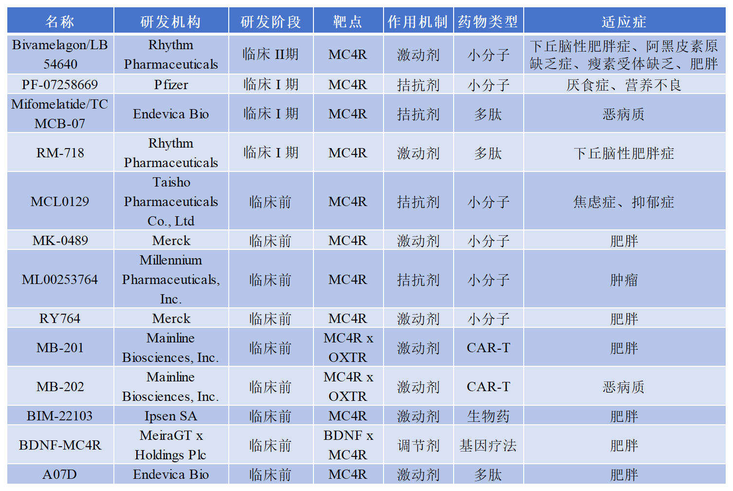 除去临床阶段终止及无进展的几款药物,目前共有多款处于临床及临床前的靶向MC4R的药物,既有小分子药物也有多肽类药物。部分信息如下: