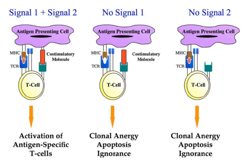 但仅有信号1无法有效激活T细胞的免疫反应,还需要足够的共刺激信号(信号2)。信号2不是抗原特异性的,而是通过抗原呈递细胞上表达的共刺激信号分子和T细胞的相互作用而实现的。共刺激信号对于T细胞的增殖,分化和存活是必要的。如果没有共刺激信号,可能会出现T细胞无应答/应答低下,细胞死亡或者会有免疫耐受的情况。
