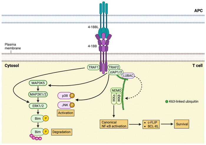 4-1BB的配体是4-1BBL(也称为TNFSF9或CD137L)。4-1BBL是TNF超家族的II型膜蛋白。在与抗原呈递细胞(APC)上的 4-1BBL 相互作用后,4-1BB 信号传导首先将TRAF1和TRAF2与cIAP1和cIAP2一起募集到位于 4-1BB 细胞质尾部的 TRAF 结合基序,形成 4-1BB 信号复合物。TRAF1 和 TRAF2 通过 TRAF1 刺激 ERK1/2 活性导致 ERK1/2 激活。ERK1/2 的激活还诱导促细胞凋亡蛋白 Bim 的磷酸化,使Bim的蛋白酶体降解,进而促进了 T 细胞存活。在 4-1BB 诱导的 NF-κB 激活的背景下,TRAF2-cIAP 复合物启动 NF-κB 通路。IKK 复合物由三个亚基组成:两个激酶 IKKα 和 IKKβ,以及调节亚基 NF-κB 必需调节剂 (NEMO;也称为 IKKγ)。NF-κB诱导BCL-XL、BCL-2和c-FLIP的转录,刺激IL-2、IL-4和IFN-γ的表达,促进T细胞的存活和细胞毒性活性。此外,TRAF2 募集促进 JNK 和 p38 MAPK 通路的激活。JNK 易位到细胞核中,与转录因子 JUN 和 ATF2 相互作用,导致 T 细胞产生 IL-2、IL-4 和 IFN-γ。